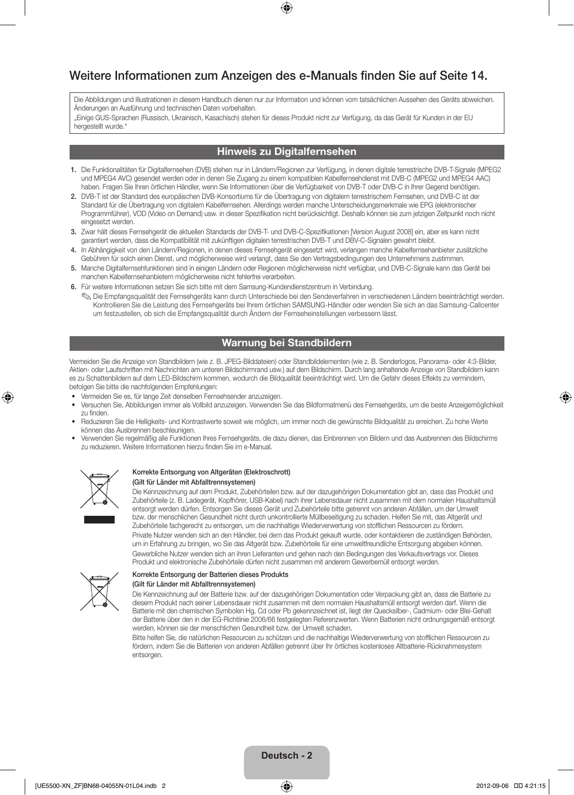 - Verwenden Sie regelmäßig alle Funktionen Ihres Fernsehgeräts, die dazu dienen, das Einbrennen von Bildern und das Ausbrennen des Bildschirms zu reduzieren. Weitere Informationen hierzu finden Sie im e-Manual. Korrekte Entsorgung von Altgeräten (Elektroschrott) (Gilt für Länder mit Abfalltrennsystemen) Die Kennzeichnung auf dem Produkt, Zubehörteilen bzw. auf der dazugehörigen Dokumentation gibt an, dass das Produkt und Zubehörteile (z. B. Ladegerät, Kopfhörer, USB-Kabel) nach ihrer Lebensdauer nicht zusammen mit dem normalen Haushaltsmüll entsorgt werden dürfen. Entsorgen Sie dieses Gerät und Zubehörteile bitte getrennt von anderen Abfällen, um der Umwelt bzw. der menschlichen Gesundheit nicht durch unkontrollierte Müllbeseitigung zu schaden. Helfen Sie mit, das Altgerät und Zubehörteile fachgerecht zu entsorgen, um die nachhaltige Wiederverwertung von stofflichen Ressourcen zu fördern. Private Nutzer wenden sich an den Händler, bei dem das Produkt gekauft wurde, oder kontaktieren die zuständigen Behörden, um in Erfahrung zu bringen, wo Sie das Altgerät bzw. Zubehörteile für eine umweltfreundliche Entsorgung abgeben können. Gewerbliche Nutzer wenden sich an ihren Lieferanten und gehen nach den Bedingungen des Verkaufsvertrags vor. Dieses Produkt und elektronische Zubehörteile dürfen nicht zusammen mit anderem Gewerbemüll entsorgt werden. Korrekte Entsorgung der Batterien dieses Produkts (Gilt für Länder mit Abfalltrennsystemen) Die Kennzeichnung auf der Batterie bzw. auf der dazugehörigen Dokumentation oder Verpackung gibt an, dass die Batterie zu diesem Produkt nach seiner Lebensdauer nicht zusammen mit dem normalen Haushaltsmüll entsorgt werden darf. Wenn die Batterie mit den chemischen Symbolen Hg, Cd oder Pb gekennzeichnet ist, liegt der Quecksilber-, Cadmium- oder Blei-Gehalt der Batterie über den in der EG-Richtlinie 2006/66 festgelegten Referenzwerten. Wenn Batterien nicht ordnungsgemäß entsorgt werden, können sie der menschlichen Gesundheit bzw. der Umwelt schaden. Bitte helfen Sie, die natürlichen Ressourcen zu schützen und die nachhaltige Wiederverwertung von stofflichen Ressourcen zu fördern, indem Sie die Batterien von anderen Abfällen getrennt über Ihr örtliches kostenloses Altbatterie-Rücknahmesystem entsorgen. Deutsch - 2 [UE5500-XN_ZF]BN68-04055N-01L04.indb 2 2012-09-06 4:21:15 Absichern des Aufstellbereichs Halten Sie die erforderlichen Abstände zwischen dem Gerät und anderen Objekten (z.B. Wänden) ein, um eine ausreichende Lüftung sicherzustellen. Wenn Sie dies nicht tun, besteht die Gefahr, dass aufgrund eines Anstiegs der Temperatur im Innern des Geräts ein Brand ausbricht oder andere Probleme mit dem Gerät auftreten. ✎✎ Wenn Sie einen Standfuß oder eine Wandhalterung einsetzen, verwenden Sie ausschließlich Teile von Samsung Electronics.
