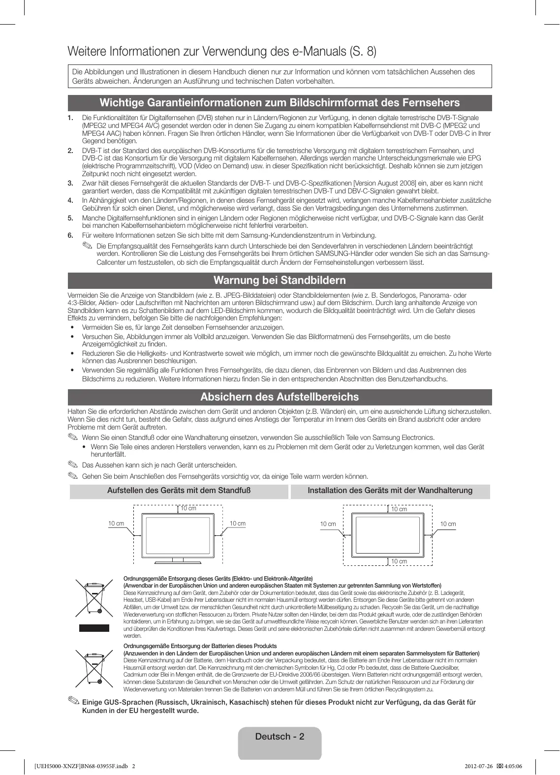 - Wenn Sie Teile eines anderen Herstellers verwenden, kann es zu Problemen mit dem Gerät oder zu Verletzungen kommen, weil das Gerät herunterfällt. ✎✎ Das Aussehen kann sich je nach Gerät unterscheiden. ✎✎ Gehen Sie beim Anschließen des Fernsehgeräts vorsichtig vor, da einige Teile warm werden können. Aufstellen des Geräts mit dem Standfuß Installation des Geräts mit der Wandhalterung 10 cm 10 cm 10 cm 10 cm 10 cm 10 cm 10 cm Ordnungsgemäße Entsorgung dieses Geräts (Elektro- und Elektronik-Altgeräte) (Anwendbar in der Europäischen Union und anderen europäischen Staaten mit Systemen zur getrennten Sammlung von Wertstoffen) Diese Kennzeichnung auf dem Gerät, dem Zubehör oder der Dokumentation bedeutet, dass das Gerät sowie das elektronische Zubehör (z. B. Ladegerät, Headset, USB-Kabel) am Ende ihrer Lebensdauer nicht im normalen Hausmüll entsorgt werden dürfen. Entsorgen Sie diese Geräte bitte getrennt von anderen Abfällen, um der Umwelt bzw. der menschlichen Gesundheit nicht durch unkontrollierte Müllbeseitigung zu schaden. Recyceln Sie das Gerät, um die nachhaltige Wiederverwertung von stofflichen Ressourcen zu fördern. Private Nutzer sollten den Händler, bei dem das Produkt gekauft wurde, oder die zuständigen Behörden kontaktieren, um in Erfahrung zu bringen, wie sie das Gerät auf umweltfreundliche Weise recyceln können. Gewerbliche Benutzer wenden sich an ihren Lieferanten und überprüfen die Konditionen Ihres Kaufvertrags. Dieses Gerät und seine elektronischen Zubehörteile dürfen nicht zusammen mit anderem Gewerbemüll entsorgt werden. Ordnungsgemäße Entsorgung der Batterien dieses Produkts (Anzuwenden in den Ländern der Europäischen Union und anderen europäischen Ländern mit einem separaten Sammelsystem für Batterien) Diese Kennzeichnung auf der Batterie, dem Handbuch oder der Verpackung bedeutet, dass die Batterie am Ende ihrer Lebensdauer nicht im normalen Hausmüll entsorgt werden darf. Die Kennzeichnung mit den chemischen Symbolen für Hg, Cd oder Pb bedeutet, dass die Batterie Quecksilber, Cadmium oder Blei in Mengen enthält, die die Grenzwerte der EU-Direktive 2006/66 übersteigen. Wenn Batterien nicht ordnungsgemäß entsorgt werden, können diese Substanzen die Gesundheit von Menschen oder die Umwelt gefährden. Zum Schutz der natürlichen Ressourcen und zur Förderung der Wiederverwertung von Materialien trennen Sie die Batterien von anderem Müll und führen Sie sie Ihrem örtlichen Recyclingsystem zu. ✎✎Einige GUS-Sprachen (Russisch, Ukrainisch, Kasachisch) stehen für dieses Produkt nicht zur Verfügung, da das Gerät für Kunden in der EU hergestellt wurde. Deutsch - 2 [UEH5000-XNZF]BN68-03955F.indb 2 2012-07-26 4:05:06 Zubehör ✎✎Vergewissern Sie sich, dass im Lieferumfang des Fernsehgeräts folgende Komponenten enthalten sind. Falls irgendwelche Teile fehlen sollten, setzen Sie sich bitte mit Ihrem Händler in Verbindung. ✎✎Die Farbe und die Form der Teile können sich je nach Modell unterscheiden. ✎✎Kabel, die nicht zum Paketinhalt gehören, können gesondert erworben werden. yy Fernbedienung und 2 Batterien (Typ AAA) yy Garantiekarte / Sicherheitshinweise (nicht überall verfügbar) yy Netzkabel yy Bedienungsanleitung Deutsch Montieren des Standfußes mit Kabelhalter yy Standfuß mit Kabelhalter ✎✎Verwaltungskosten werden abgerechnet, wenn: (a) auf Ihren Wunsch ein Techniker gerufen wird und kein Defekt des Geräts vorliegt (d.h. wenn Sie dieses Benutzerhandbuch nicht gelesen haben). (b) Sie das Gerät in eine Reparaturwerkstatt bringen und kein Defekt des Geräts vorliegt (d.h. wenn Sie dieses Benutzerhandbuch nicht gelesen haben). ✎✎Der abgerechnete Betrag wird Ihnen mitgeteilt, ehe irgendwelche Arbeiten oder Kundenbesuche ausgeführt werden. Verwenden der Bedieneinheit des Fernsehers (Tasten) Der TV-Controller verfügt über einen Knopf, den Sie in alle Richtungen bewegen können, und der die Navigation auch ohne Fernbedienung ermöglicht. Funktionsmenü ✎✎Manche Funktionen, für die Sie eine PIN eingeben müssen, stehen möglicherweise nicht zur Verfügung. Ab (Vorn) Rechts Links ✎✎Form und Farbe des Geräts können sich je nach Modell Zurück unterscheiden. ✎✎Wenn Sie den Steuerknopf länger als 1 Sekunde gedrückt Auf (Hinten) halten, wird das Menü geschlossen. ✎✎Achten Sie beim Auswählen der Funktion durch Bewegen des Steuerknopf nach oben/unten/links/rechts darauf, dass Sie den Steuerknopf nicht nach unten drücken. Wenn Sie ihn zuerst nach unten drücken, können Sie ihn nicht mehr nach oben/unten/link/rechts bewegen. Fernbedienungssensor TV-Steuerknopf Einschalten Wenn sich das Fernsehgerät im Standbymodus befindet, können Sie es durch Drücken des Steuerknopfes einschalten. Einstellen der Lautstärke Wenn das Fernsehgerät eingeschaltet ist, können Sie die Lautstärke durch Bewegen des Steuerknopfes nach links oder rechts einstellen. Auswählen eines Senders Wenn das Fernsehgerät eingeschaltet ist, können Sie einen Sender durch Bewegen des Steuerknopfes nach oben oder unten auswählen. Verwenden des Funktionsmenüs Zum Anzeigen des Funktionsmenüs drücken Sie bei eingeschaltetem Fernsehgerät den Steuerknopf. Beim nochmaligem Drücken wird das Fenster des Funktionsmenüs geschlossen. Verwenden des Menüs Zum Auswählen von MENÜ(m) bewegen Sie innerhalb des Funktionsmenüs den Steuerknopf. Das Bildschirmmenü (OSD) der jeweiligen Funktion Ihres Fernsehgeräts wird angezeigt. Auswählen der Signalquelle Zum Auswählen der Quelle( ) bewegen Sie innerhalb des Funktionsmenüs den Steuerknopf. Die Liste der verfügbaren Quellen wird angezeigt. Auswählen der Startseite Inhalt Zum Auswählen der Startseite Inhalt( ) bewegen Sie innerhalb des Funktionsmenüs den Steuerknopf. Das Fenster Startseite Inhalt wird angezeigt. Ausschalten Zum Ausschalten(P) des Fernsehgeräts bewegen Sie innerhalb des Funktionsmenüs den Steuerknopf. Standby-Modus Der Standby-Modus ist n