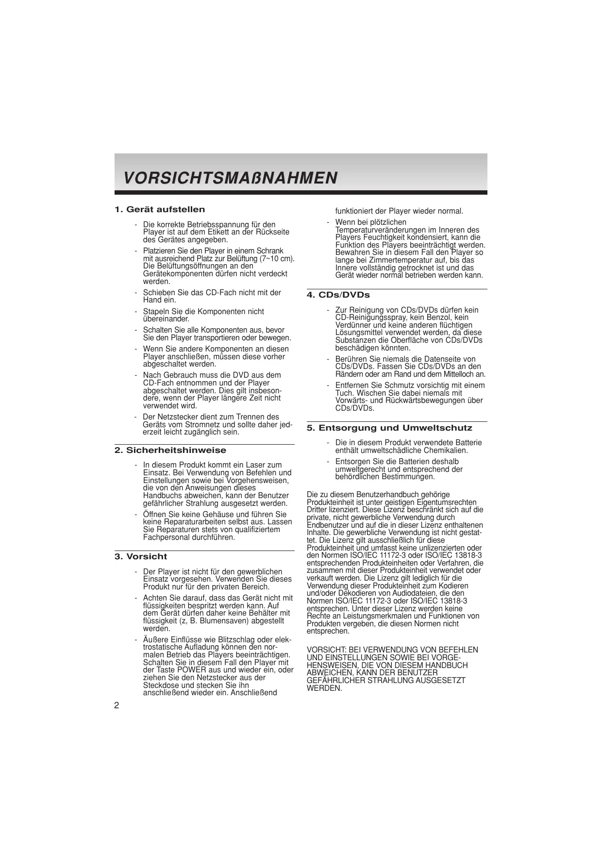 - Der Player ist nicht für den gewerblichen Einsatz vorgesehen. Verwenden Sie dieses Produkt nur für den privaten Bereich. - Achten Sie darauf, dass das Gerät nicht mit flüssigkeiten bespritzt werden kann. Auf dem Gerät dürfen daher keine Behälter mit flüssigkeit (z, B. Blumensaven) abgestellt werden. - Äußere Einflüsse wie Blitzschlag oder elektrostatische Aufladung können den normalen Betrieb das Players beeinträchtigen. Schalten Sie in diesem Fall den Player mit der Taste POWER aus und wieder ein, oder ziehen Sie den Netzstecker aus der Steckdose und stecken Sie ihn anschließend wieder ein. Anschließend