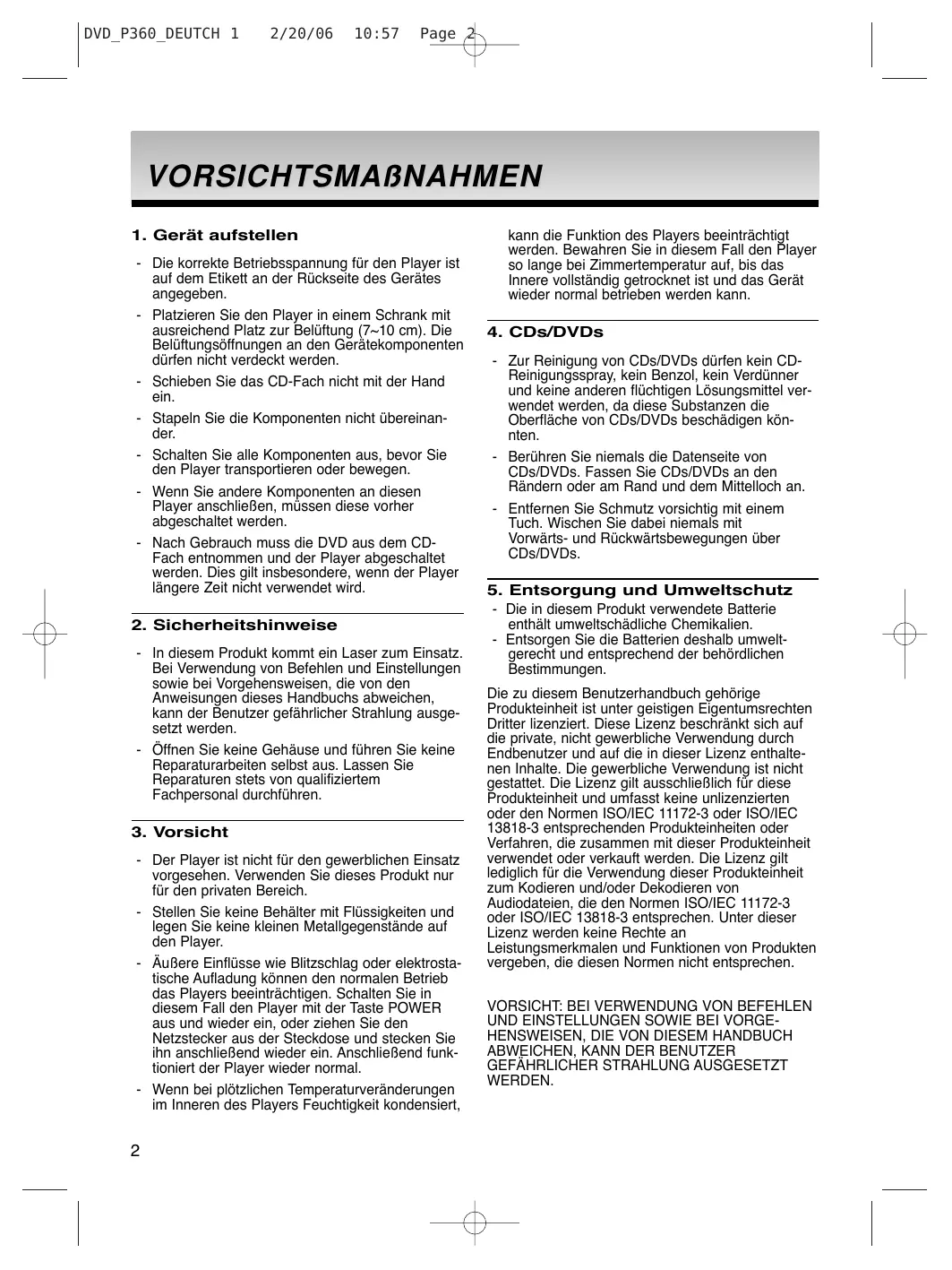 2/20/06 11:04 Page 34 Korrekte Entsorgung von Altgeräten (Elektroschrott) (In den Ländern der Europäischen Union und anderen europäischen Ländern mit einem separaten Sammelsystem) Die Kennzeichnung auf dem Produkt bzw. auf der dazugehörigen Dokumentation gibt an, dass es nach seiner Lebensdauer nicht zusammen mit dem normalen Haushaltsmüll entsorgt werden darf. Entsorgen Sie dieses Gerät bitte getrennt von anderen Abfällen, um der Umwelt bzw. der menschlichen Gesundheit nicht durch unkontrollierte Müllbeseitigung zu schaden. Helfen Sie mit, das Altgerät fachgerecht zu entsorgen, um die nachhaltige Wiederverwertung von stofflichen Ressourcen zu fördern. Private Nutzer wenden sich an den Händler, bei dem das Produkt gekauft wurde, oder kontaktieren die zuständigen Behörden, um in Erfahrung zu bringen, wo Sie das Altgerät für eine umweltfreundliche Entsorgung abgeben können. Gewerbliche Nutzer wenden sich an ihren Lieferanten und gehen nach den Bedingungen des Verkaufsvertrags vor. Dieses Produkt darf nicht zusammen mit anderem Gewerbemüll entsorgt werden. DVD_P360_XEL Fra 1 2/20/06 10:29 Page 2 PRÉCAUTIONS