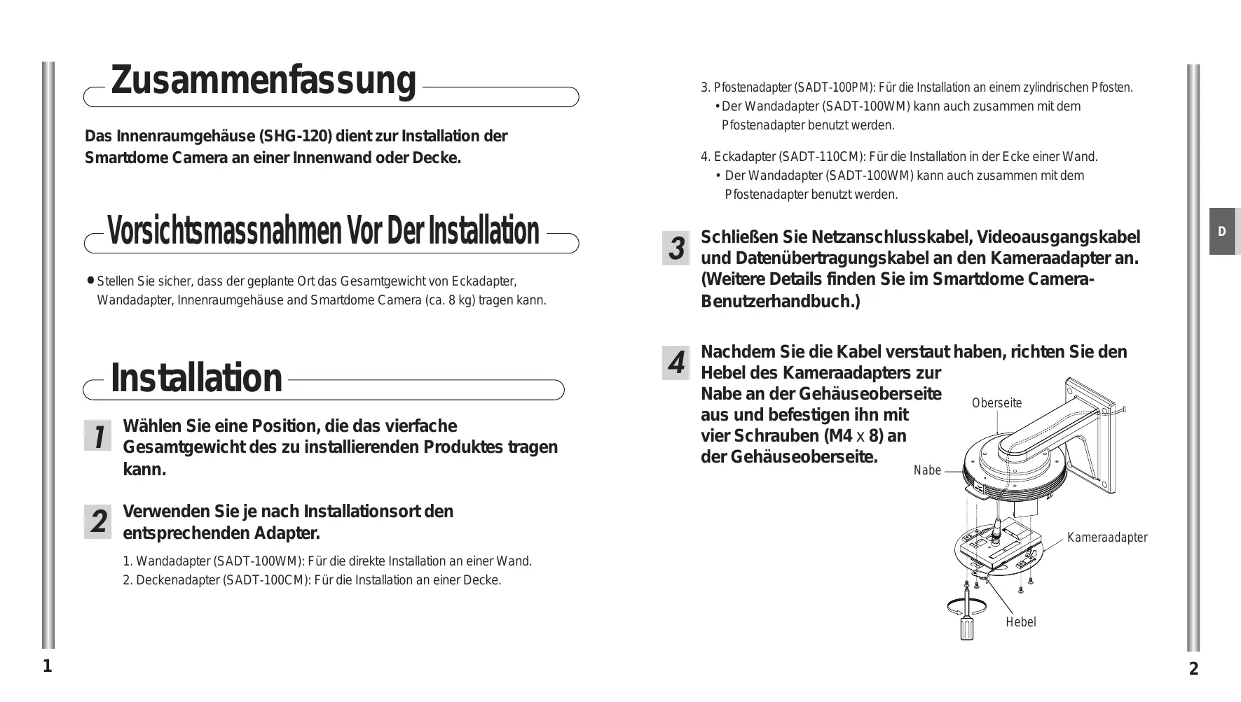 1. Wandadapter (SADT-100WM): Für die direkte Installation an einer Wand. 2. Deckenadapter (SADT-100CM): Für die Installation an einer Decke. Hebel