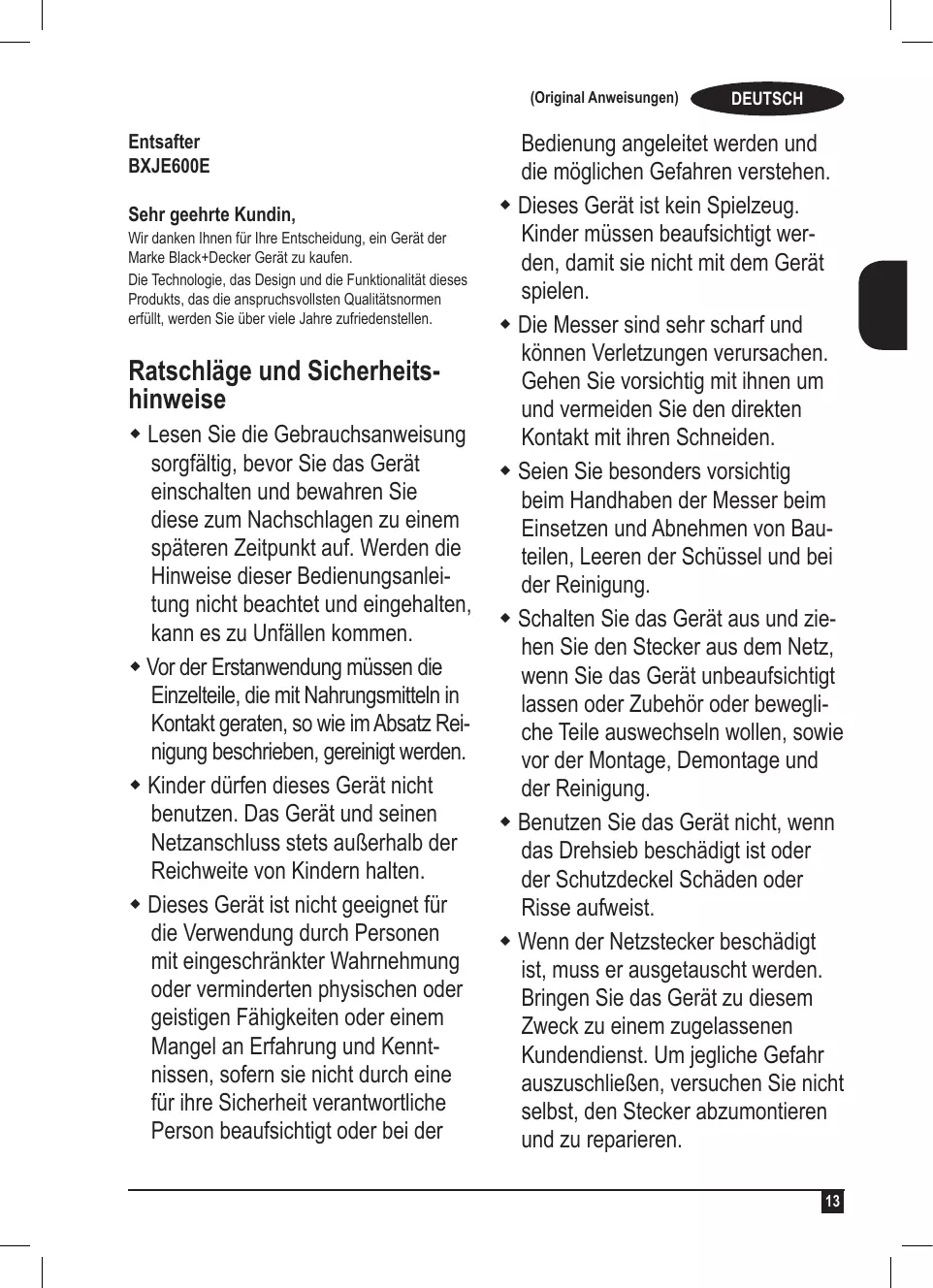 (Original Anweisungen) Entsafter BXJE600E Sehr geehrte Kundin, Wir danken Ihnen für Ihre Entscheidung, ein Gerät der Marke Black+Decker Gerät zu kaufen. Die Technologie, das Design und die Funktionalität dieses Produkts, das die anspruchsvollsten Qualitätsnormen erfüllt, werden Sie über viele Jahre zufriedenstellen. Ratschläge und Sicherheitshinweise Lesen Sie die Gebrauchsanweisung sorgfältig, bevor Sie das Gerät einschalten und bewahren Sie diese zum Nachschlagen zu einem späteren Zeitpunkt auf. Werden die Hinweise dieser Bedienungsanleitung nicht beachtet und eingehalten, kann es zu Unfällen kommen. Vor der Erstanwendung müssen die Einzelteile, die mit Nahrungsmitteln in Kontakt geraten, so wie im Absatz Reinigung beschrieben, gereinigt werden. Kinder dürfen dieses Gerät nicht benutzen. Das Gerät und seinen Netzanschluss stets außerhalb der Reichweite von Kindern halten. Dieses Gerät ist nicht geeignet für die Verwendung durch Personen mit eingeschränkter Wahrnehmung oder verminderten physischen oder geistigen Fähigkeiten oder einem Mangel an Erfahrung und Kenntnissen, sofern sie nicht durch eine für ihre Sicherheit verantwortliche Person beaufsichtigt oder bei der DEUTSCH Bedienung angeleitet werden und die möglichen Gefahren verstehen. Dieses Gerät ist kein Spielzeug. Kinder müssen beaufsichtigt werden, damit sie nicht mit dem Gerät spielen. Die Messer sind sehr scharf und können Verletzungen verursachen. Gehen Sie vorsichtig mit ihnen um und vermeiden Sie den direkten Kontakt mit ihren Schneiden. Seien Sie besonders vorsichtig beim Handhaben der Messer beim Einsetzen und Abnehmen von Bauteilen, Leeren der Schüssel und bei der Reinigung. Schalten Sie das Gerät aus und ziehen Sie den Stecker aus dem Netz, wenn Sie das Gerät unbeaufsichtigt lassen oder Zubehör oder bewegliche Teile auswechseln wollen, sowie vor der Montage, Demontage und der Reinigung. Benutzen Sie das Gerät nicht, wenn das Drehsieb beschädigt ist oder der Schutzdeckel Schäden oder Risse aufweist. Wenn der Netzstecker beschädigt ist, muss er ausgetauscht werden. Bringen Sie das Gerät zu diesem Zweck zu einem zugelassenen Kundendienst. Um jegliche Gefahr auszuschließen, versuchen Sie nicht selbst, den Stecker abzumontieren und zu reparieren.