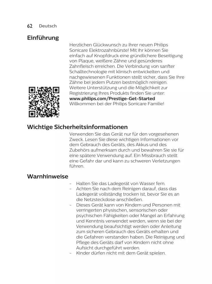 Deutsch Einführung Herzlichen Glückwunsch zu Ihrer neuen Philips Sonicare Elektrozahnbürste! Mit ihr können Sie einfach auf Knopfdruck eine gründlichere Beseitigung von Plaque, weißere Zähne und gesünderes Zahnfleisch erreichen. Die Verbindung von sanfter Schalltechnologie mit klinisch entwickelten und nachgewiesenen Funktionen stellt sicher, dass Sie Ihre Zähne bei jedem Putzen bestmöglich reinigen. Weitere Unterstützung und die Möglichkeit zur Registrierung Ihres Produkts finden Sie unter: www.philips.com/Prestige-Get-Started Willkommen bei der Philips Sonicare Familie! Wichtige Sicherheitsinformationen Verwenden Sie das Gerät nur für den vorgesehenen Zweck. Lesen Sie diese wichtigen Informationen vor dem Gebrauch des Geräts, des Akkus und des Zubehörs aufmerksam durch und bewahren Sie sie für eine spätere Verwendung auf. Ein Missbrauch stellt eine Gefahr dar und kann zu schweren Verletzungen führen. Warnhinweise