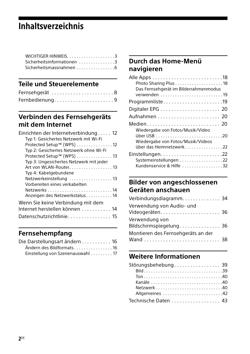 - DiSEqC™ is een handelsmerk van EUTELSAT. Deze tv biedt ondersteuning voor DiSEqC 1.0. Deze tv is niet geschikt voor het aansturen van gemotoriseerde antennes. 44NL Actual resolution: 3840 x 2160 pixels. Résolution actuelle: 3840 x 2160 pixels. 3840 x 2160 pixel. Resolução do ecrã: 3840 x 2160 pixels. Resolución real: 3840 x 2160 píxeles. πραγματική ανάλυση: 3840 x 2160 pixels. Inhaltsverzeichnis WICHTIGER HINWEIS. . . . . . . . . . . . . . . . . . . . 3 Sicherheitsinformationen . . . . . . . . . . . . . . . 3 Sicherheitsmassnahmen . . . . . . . . . . . . . . . .6 Durch das Home-Menü navigieren Alle Apps . . . . . . . . . . . . . . . . . . . . . . . . . . 18 Teile und Steuerelemente Fernsehgerät . . . . . . . . . . . . . . . . . . . . . . . 8 Fernbedienung . . . . . . . . . . . . . . . . . . . . . . 9 Verbinden des Fernsehgeräts mit dem Internet Einrichten der Internetverbindung . . . . . 12 Typ 1: Gesichertes Netzwerk mit Wi-Fi Protected Setup™ (WPS) . . . . . . . . . . . . . . . 12 Typ 2: Gesichertes Netzwerk ohne Wi-Fi Protected Setup™ (WPS) . . . . . . . . . . . . . . . 13 Typ 3: Ungesichertes Netzwerk mit jeder Art von WLAN-Router. . . . . . . . . . . . . . . . . . 13 Typ 4: Kabelgebundene Netzwerkeinstellung . . . . . . . . . . . . . . . . . . 13 Vorbereiten eines verkabelten Netzwerks . . . . . . . . . . . . . . . . . . . . . . . . . . . 14 Anzeigen des Netzwerkstatus . . . . . . . . . . . 14 Wenn Sie keine Verbindung mit dem Internet herstellen können . . . . . . . . . . . 14 Datenschutzrichtlinie. . . . . . . . . . . . . . . . 15 Fernsehempfang Die Darstellungsart ändern . . . . . . . . . . . 16 Ändern des Bildformats . . . . . . . . . . . . . . . . 16 Einstellung von Szenenauswahl . . . . . . . . . 17 Photo Sharing Plus . . . . . . . . . . . . . . . . . . . . 18 Das Fernsehgerät im Bilderrahmenmodus verwenden . . . . . . . . . . . . . . . . . . . . . . . . . . 19 Programmliste . . . . . . . . . . . . . . . . . . . . . . 19 Digitaler EPG . . . . . . . . . . . . . . . . . . . . . . 20 Aufnahmen . . . . . . . . . . . . . . . . . . . . . . . 20 Medien . . . . . . . . . . . . . . . . . . . . . . . . . . . 20 Wiedergabe von Fotos/Musik/Video über USB . . . . . . . . . . . . . . . . . . . . . . . . . . . .20 Wiedergabe von Fotos/Musik/Videos über das Heimnetzwerk. . . . . . . . . . . . . . . . 22 Einstellungen. . . . . . . . . . . . . . . . . . . . . . .22 Systemeinstellungen . . . . . . . . . . . . . . . . . . 22 Kundenservice & Hilfe . . . . . . . . . . . . . . . . . 32 Bilder von angeschlossenen Geräten anschauen Verbindungsdiagramm. . . . . . . . . . . . . . Verwendung von Audio- und Videogeräten. . . . . . . . . . . . . . . . . . . . . . Verwendung von Bildschirmspiegelung . . . . . . . . . . . . . . . Montieren des Fernsehgeräts an der Wand . . . . . . . . . . . . . . . . . . . . . . . . . . . .