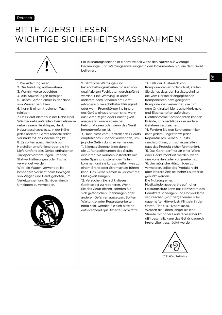 1. Lire ces instructions. 2. Conserver ces instructions. 3. Prendre en considération les mises en garde. 4. Suivre toutes les instructions. 5. Après avoir déballé le produit, veiller à ne pas laisser l’emballage à portée des enfants. Il présente un risque de suffocation. 5. Ne pas utiliser pas cet appareil à proximité de l’eau. 6. Nettoyer uniquement avec un chiffon sec. 7. Ne pas installer l’appareil à proximité d’une source de chaleur telle qu’un radiateur, une cuisinière, une bouche de chauffage ou tout autre appareil ou tout dispositif (y compris les amplificateurs) dissipant de la chaleur. 8. Utiliser uniquement les accessoires recommandés par le fabricant. 9. N’utiliser que les chariots, pieds, trépieds, supports ou tables recommandés par le fabricant ou ceux vendus avec l’appareil. Lorsqu’un chariot est utilisé, redoubler de prudence pendant le déplacement de l’ensemble chariot/appareil afin d’éviter toute blessure par basculement. 10. Toute tâche de maintenance doit être réalisée par un personnel qualifié. Une maintenance est nécessaire à la suite de tout dommage occasionné à l’appareil tel que la détérioration du câble ou de la fiche d’alimentation, le déversement de liquide ou l’insertion d’objets à l’intérieur de l’appareil, l’exposition à la pluie ou à l’humidité, le mauvais fonctionnement ou la chute de l’appareil.
