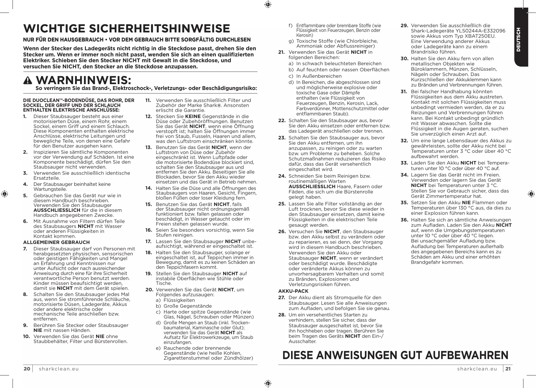 Shark-Ladegeräte YLS0244A-E332096 sowie Akkus vom Typ XBAT250EU. Eine Verwendung anderer Akkus oder Ladegeräte kann zu einem Brandrisiko führen.