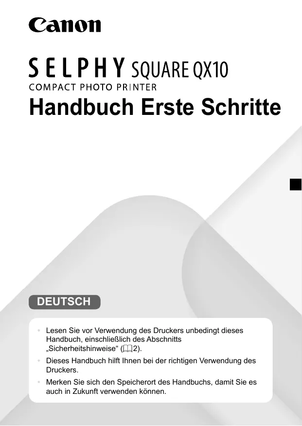 Laden Sie die Anleitung für Ihr Fotodrucker kostenlos im PDF-Format! Finden Sie Ihr Handbuch SELPHYSQUARE QX10S - CANON und nehmen Sie Ihr elektronisches Gerät wieder in die Hand. Auf dieser Seite sind alle Dokumente veröffentlicht, die für die Verwendung Ihres Geräts notwendig sind. SELPHYSQUARE QX10S von der Marke CANON.