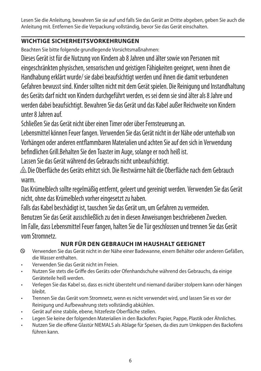 Dieses Gerät ist für die Nutzung von Kindern ab 8 Jahren und älter sowie von Personen mit eingeschränkten physischen, sensorischen und geistigen Fähigkeiten geeignet, wenn ihnen die Handhabung erklärt wurde/ sie dabei beaufsichtigt werden und ihnen die damit verbundenen Gefahren bewusst sind. Kinder sollten nicht mit dem Gerät spielen. Die Reinigung und Instandhaltung des Geräts darf nicht von Kindern durchgeführt werden, es sei denn sie sind älter als 8 Jahre und werden dabei beaufsichtigt. Bewahren Sie das Gerät und das Kabel außer Reichweite von Kindern unter 8 Jahren auf. Schließen Sie das Gerät nicht über einen Timer oder über Fernsteuerung an. Lebensmittel können Feuer fangen. Verwenden Sie das Gerät nicht in der Nähe oder unterhalb von Vorhängen oder anderen entflammbaren Materialien und achten Sie auf den sich in Verwendung befindlichen Grill.Behalten Sie den Toaster im Auge, solange er noch heiß ist. Lassen Sie das Gerät während des Gebrauchs nicht unbeaufsichtigt. h Die Oberfläche des Geräts erhitzt sich. Die Restwärme hält die Oberfläche nach dem Gebrauch warm. Das Krümelblech sollte regelmäßig entfernt, geleert und gereinigt werden. Verwenden Sie das Gerät nicht, ohne das Krümelblech vorher eingesetzt zu haben. Falls das Kabel beschädigt ist, tauschen Sie das Gerät um, um Gefahren zu vermeiden. Benutzen Sie das Gerät ausschließlich zu den in diesen Anweisungen beschriebenen Zwecken. Im Falle, dass Lebensmittel Feuer fangen, halten Sie die Tür geschlossen und trennen Sie das Gerät vom Stromnetz. NUR FÜR DEN GEBRAUCH IM HAUSHALT GEEIGNET