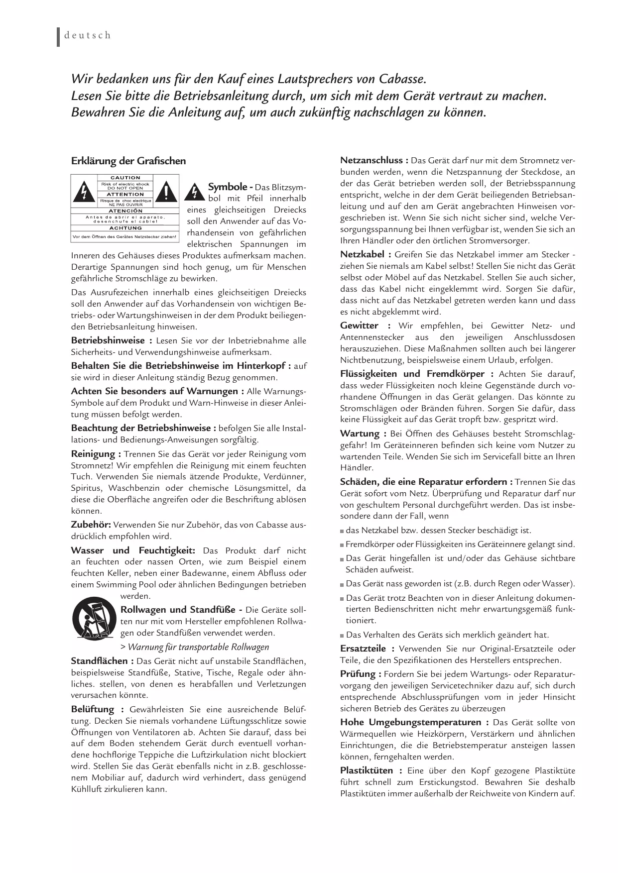 Because of technical improvements already under way in our constant search for optimum quality, Cabasse reserves the right to modify all the models presented in specification sheets, advertising materials and manuals without prior notice. deutsch Wir bedanken uns für den Kauf eines Lautsprechers von Cabasse. Lesen Sie bitte die Betriebsanleitung durch, um sich mit dem Gerät vertraut zu machen. Bewahren Sie die Anleitung auf, um auch zukünftig nachschlagen zu können. Netzanschluss : Das Gerät darf nur mit dem Stromnetz ver- Erklärung der Grafischen Symbole - Das Blitzsymbol mit Pfeil innerhalb eines gleichseitigen Dreiecks soll den Anwender auf das Vorhandensein von gefährlichen elektrischen Spannungen im Inneren des Gehäuses dieses Produktes aufmerksam machen. Derartige Spannungen sind hoch genug, um für Menschen gefährliche Stromschläge zu bewirken. Das Ausrufezeichen innerhalb eines gleichseitigen Dreiecks soll den Anwender auf das Vorhandensein von wichtigen Betriebs- oder Wartungshinweisen in der dem Produkt beiliegenden Betriebsanleitung hinweisen. Betriebshinweise : Lesen Sie vor der Inbetriebnahme alle Sicherheits- und Verwendungshinweise aufmerksam. Behalten Sie die Betriebshinweise im Hinterkopf : auf sie wird in dieser Anleitung ständig Bezug genommen. Achten Sie besonders auf Warnungen : Alle WarnungsSymbole auf dem Produkt und Warn-Hinweise in dieser Anleitung müssen befolgt werden. Beachtung der Betriebshinweise : befolgen Sie alle Installations- und Bedienungs-Anweisungen sorgfältig. Reinigung : Trennen Sie das Gerät vor jeder Reinigung vom Stromnetz! Wir empfehlen die Reinigung mit einem feuchten Tuch. Verwenden Sie niemals ätzende Produkte, Verdünner, Spiritus, Waschbenzin oder chemische Lösungsmittel, da diese die Oberfläche angreifen oder die Beschriftung ablösen können. Zubehör: Verwenden Sie nur Zubehör, das von Cabasse ausdrücklich empfohlen wird. Wasser und Feuchtigkeit: Das Produkt darf nicht an feuchten oder nassen Orten, wie zum Beispiel einem feuchten Keller, neben einer Badewanne, einem Abfluss oder einem Swimming Pool oder ähnlichen Bedingungen betrieben werden. Rollwagen und Standfüße - Die Geräte sollten nur mit vom Hersteller empfohlenen Rollwagen oder Standfüßen verwendet werden. bunden werden, wenn die Netzspannung der Steckdose, an der das Gerät betrieben werden soll, der Betriebsspannung entspricht, welche in der dem Gerät beiliegenden Betriebsanleitung und auf den am Gerät angebrachten Hinweisen vorgeschrieben ist. Wenn Sie sich nicht sicher sind, welche Versorgungsspannung bei Ihnen verfügbar ist, wenden Sie sich an Ihren Händler oder den örtlichen Stromversorger. Netzkabel : Greifen Sie das Netzkabel immer am Stecker ziehen Sie niemals am Kabel selbst! Stellen Sie nicht das Gerät selbst oder Möbel auf das Netzkabel. Stellen Sie auch sicher, dass das Kabel nicht eingeklemmt wird. Sorgen Sie dafür, dass nicht auf das Netzkabel getreten werden kann und dass es nicht abgeklemmt wird. Gewitter : Wir empfehlen, bei Gewitter Netz- und Antennenstecker aus den jeweiligen Anschlussdosen herauszuziehen. Diese Maßnahmen sollten auch bei längerer Nichtbenutzung, beispielsweise einem Urlaub, erfolgen. Flüssigkeiten und Fremdkörper : Achten Sie darauf, dass weder Flüssigkeiten noch kleine Gegenstände durch vorhandene Öffnungen in das Gerät gelangen. Das könnte zu Stromschlägen oder Bränden führen. Sorgen Sie dafür, dass keine Flüssigkeit auf das Gerät tropft bzw. gespritzt wird. Wartung : Bei Öffnen des Gehäuses besteht Stromschlaggefahr! Im Geräteinneren befinden sich keine vom Nutzer zu wartenden Teile. Wenden Sie sich im Servicefall bitte an Ihren Händler. Schäden, die eine Reparatur erfordern : Trennen Sie das Gerät sofort vom Netz. Überprüfung und Reparatur darf nur von geschultem Personal durchgeführt werden. Das ist insbesondere dann der Fall, wenn das Netzkabel bzw. dessen Stecker beschädigt ist. Fremdkörper oder Flüssigkeiten ins Geräteinnere gelangt sind. as Gerät hingefallen ist und/oder das Gehäuse sichtbare Schäden aufweist. Das Gerät nass geworden ist (z.B. durch Regen oder Wasser). as Gerät trotz Beachten von in dieser Anleitung dokumenD tierten Bedienschritten nicht mehr erwartungsgemäß funktioniert. Das Verhalten des Geräts sich merklich geändert hat. > Warnung für transportable Rollwagen Standflächen : Das Gerät nicht auf unstabile Standflächen, Ersatzteile : Verwenden Sie nur Original-Ersatzteile oder Teile, die den Spezifikationen des Herstellers entsprechen. beispielsweise Standfüße, Stative, Tische, Regale oder ähnliches. stellen, von denen es herabfallen und Verletzungen verursachen könnte. Prüfung : Fordern Sie bei jedem Wartungs- oder Reparaturvorgang den jeweiligen Servicetechniker dazu auf, sich durch entsprechende Abschlussprüfungen vom in jeder Hinsicht sicheren Betrieb des Gerätes zu überzeugen Belüftung : Gewährleisten Sie eine ausreichende Belüftung. Decken Sie niemals vorhandene Lüftungsschlitze sowie Öffnungen von Ventilatoren ab. Achten Sie darauf, dass bei auf dem Boden stehendem Gerät durch eventuell vorhandene hochflorige Teppiche die Luftzirkulation nicht blockiert wird. Stellen Sie das Gerät ebenfalls nicht in z.B. geschlossenem Mobiliar auf, dadurch wird verhindert, dass genügend Kühlluft zirkulieren kann. Hohe Umgebungstemperaturen : Das Gerät sollte von Wärmequellen wie Heizkörpern, Verstärkern und ähnlichen Einrichtungen, die die Betriebstemperatur ansteigen lassen können, ferngehalten werden. Plastiktüten : Eine über den Kopf gezogene Plastiktüte führt schnell zum Erstickungstod. Bewahren Sie deshalb Plastiktüten immer außerhalb der Reichweite von Kindern auf. ANTIGUA MC170 - JERSEY MC170 - SOCOA MC170