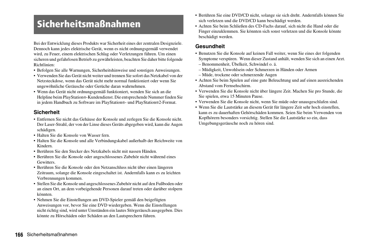 - Um einen sicheren Betrieb zu gewährleisten, prüfen Sie Netzanschluss und Netzkabelitte regelmäß. Bei Schäden verwenden Sie sie auf keinen Fall weiter und wenden sich an die Helpline beim PlayStation®-Kundendienst. Die entsprechende Nummer finden Sie in jeder Handbuch zu Software im PlayStation®- und PlayStation®2-Format.