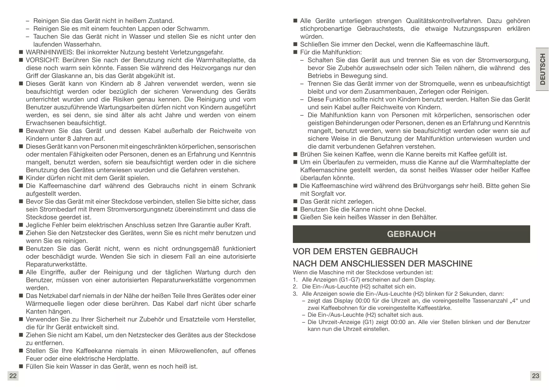 Ne débranchez pas l'appareil en tirant sur le câble. Ne placez jamais votre carafe dans un four à micro-ondes, sur une flamme ou sur une plaque électrique. Ne versez pas d’eau dans l'appareil quand il est encore chaud. Tous les appareils sont soumis à des procédures de contrôle qualité rigoureuses. Cela comprend des tests d’utilisation réels effectués sur des appareils sélectionnés aléatoirement, ce qui peut expliquer la présence éventuelle de traces d’utilisation. Fermez toujours le couvercle lorsque vous faites fonctionner la cafetière. Pour la fonction du moulin : – Éteignez l’appareil et débranchez-le avant de changer les accessoires ou d’approcher les pièces qui sont mobiles pendant l’utilisation. – Débranchez toujours l’appareil de l’alimentation s’il est laissé sans surveillance et avant le montage, le démontage ou le nettoyage. – Cette fonction ne doit pas être utilisée par les enfants. Gardez l’appareil et son câble hors de portée des enfants. – La fonction du moulin peut être utilisée par des personnes ayant des capacités physiques, sensorielles ou mentales réduites ou un manque d’expérience et de connaissances si elles ont reçu une supervision ou des instructions concernant l’utilisation de la fonction du moulin de manière sûre et si elles comprennent les dangers impliqués. – Les enfants ne doivent pas jouer avec la fonction du moulin. Ne préparez pas de café si la carafe contient déjà du café. Pour éviter tout débordement, la carafe doit être bien placée sur la base chauffante de la cafetière, sinon un débordement d'eau chaude ou de café chaud pourrait se produire.. La cafetière devient très chaude pendant le cycle d’infusion. Veuillez la manipuler avec précaution. Ne démontez pas l’appareil. N’utilisez pas la carafe sans le couvercle. Ne versez pas d’eau chaude dans le réservoir. La cafetière ne doit pas être placée dans un placard lors de son utilisation. N'utilisez pas de grains trop gras qui pourraient endommager votre appareil.