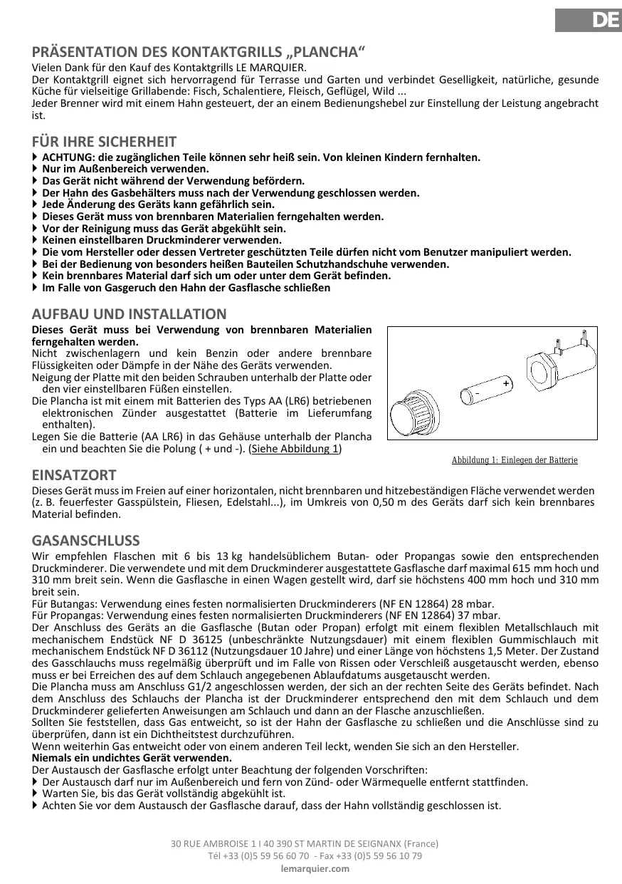 Dieses Gerät muss bei Verwendung von brennbaren Materialien ferngehalten werden. Nicht zwischenlagern und kein Benzin oder andere brennbare Flüssigkeiten oder Dämpfe in der Nähe des Geräts verwenden. Neigung der Platte mit den beiden Schrauben unterhalb der Platte oder den vier einstellbaren Füßen einstellen. Die Plancha ist mit einem mit Batterien des Typs AA (LR6) betriebenen elektronischen Zünder ausgestattet (Batterie im Lieferumfang enthalten). Legen Sie die Batterie (AA LR6) in das Gehäuse unterhalb der Plancha ein und beachten Sie die Polung ( + und -). (Siehe Abbildung 1) Abbildung 1: Einlegen der Batterie EINSATZORT Dieses Gerät muss im Freien auf einer horizontalen, nicht brennbaren und hitzebeständigen Fläche verwendet werden (z. B. feuerfester Gasspülstein, Fliesen, Edelstahl...), im Umkreis von 0,50 m des Geräts darf sich kein brennbares Material befinden. GASANSCHLUSS Wir empfehlen Flaschen mit 6 bis 13 kg handelsüblichem Butan- oder Propangas sowie den entsprechenden Druckminderer. Die verwendete und mit dem Druckminderer ausgestattete Gasflasche darf maximal 615 mm hoch und 310 mm breit sein. Wenn die Gasflasche in einen Wagen gestellt wird, darf sie höchstens 400 mm hoch und 310 mm breit sein. Für Butangas: Verwendung eines festen normalisierten Druckminderers (NF EN 12864) 28 mbar. Für Propangas: Verwendung eines festen normalisierten Druckminderers (NF EN 12864) 37 mbar. Der Anschluss des Geräts an die Gasflasche (Butan oder Propan) erfolgt mit einem flexiblen Metallschlauch mit mechanischem Endstück NF D 36125 (unbeschränkte Nutzungsdauer) mit einem flexiblen Gummischlauch mit mechanischem Endstück NF D 36112 (Nutzungsdauer 10 Jahre) und einer Länge von höchstens 1,5 Meter. Der Zustand des Gasschlauchs muss regelmäßig überprüft und im Falle von Rissen oder Verschleiß ausgetauscht werden, ebenso muss er bei Erreichen des auf dem Schlauch angegebenen Ablaufdatums ausgetauscht werden. Die Plancha muss am Anschluss G1/2 angeschlossen werden, der sich an der rechten Seite des Geräts befindet. Nach dem Anschluss des Schlauchs der Plancha ist der Druckminderer entsprechend den mit dem Schlauch und dem Druckminderer gelieferten Anweisungen am Schlauch und dann an der Flasche anzuschließen. Sollten Sie feststellen, dass Gas entweicht, so ist der Hahn der Gasflasche zu schließen und die Anschlüsse sind zu überprüfen, dann ist ein Dichtheitstest durchzuführen. Wenn weiterhin Gas entweicht oder von einem anderen Teil leckt, wenden Sie sich an den Hersteller. Niemals ein undichtes Gerät verwenden. Der Austausch der Gasflasche erfolgt unter Beachtung der folgenden Vorschriften: Der Austausch darf nur im Außenbereich und fern von Zünd- oder Wärmequelle entfernt stattfinden. Warten Sie, bis das Gerät vollständig abgekühlt ist. Achten Sie vor dem Austausch der Gasflasche darauf, dass der Hahn vollständig geschlossen ist. 30 RUE AMBROISE 1 I 40 390 ST MARTIN DE SEIGNANX (France) Tél +33 (0)5 59 56 60 70 - Fax +33 (0)5 59 56 10 79 lemarquier.com
