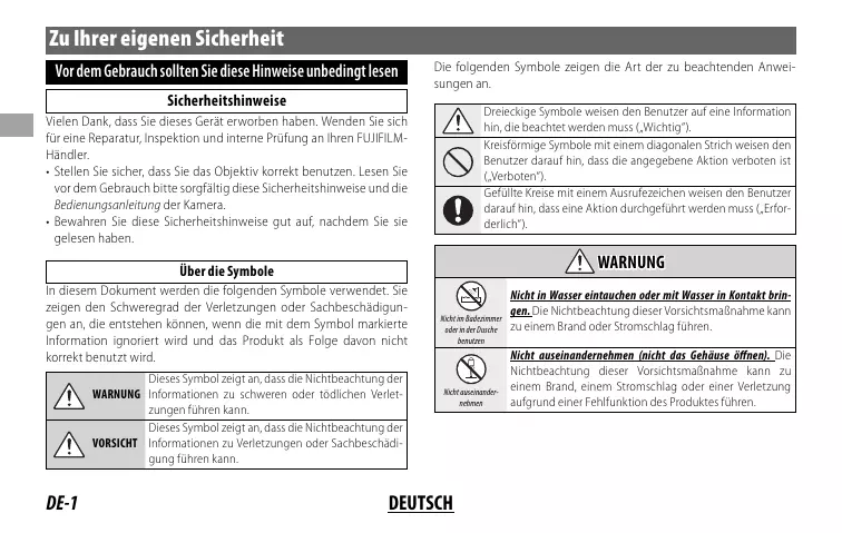 Nous vous remercions d’avoir acheté ce produit. Pour le faire réparer, inspecter ou tester, contactez votre représentant FUJIFILM. • Veillez à utiliser correctement votre objectif. Pour cela, lisez attentivement les consignes de sécurité suivantes ainsi que le Manuel du propriétaire avant de commencer à vous en servir. • Après avoir lu ces consignes de sécurité, rangez-les dans un endroit sûr.