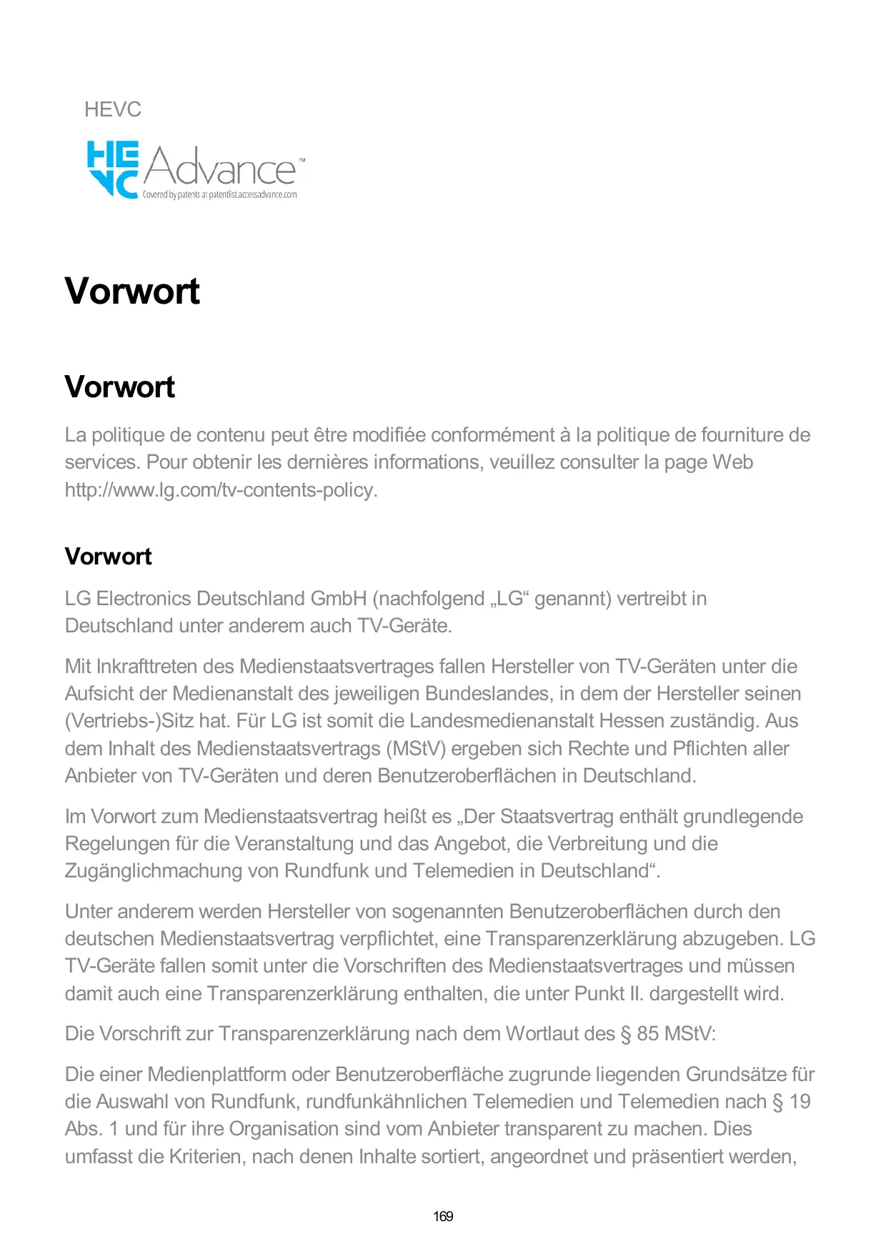 Vorwort LG Electronics Deutschland GmbH (nachfolgend „LG“ genannt) vertreibt in Deutschland unter anderem auch TV-Geräte. Mit Inkrafttreten des Medienstaatsvertrages fallen Hersteller von TV-Geräten unter die Aufsicht der Medienanstalt des jeweiligen Bundeslandes, in dem der Hersteller seinen (Vertriebs-)Sitz hat. Für LG ist somit die Landesmedienanstalt Hessen zuständig. Aus dem Inhalt des Medienstaatsvertrags (MStV) ergeben sich Rechte und Pflichten aller Anbieter von TV-Geräten und deren Benutzeroberflächen in Deutschland. Im Vorwort zum Medienstaatsvertrag heißt es „Der Staatsvertrag enthält grundlegende Regelungen für die Veranstaltung und das Angebot, die Verbreitung und die Zugänglichmachung von Rundfunk und Telemedien in Deutschland“. Unter anderem werden Hersteller von sogenannten Benutzeroberflächen durch den deutschen Medienstaatsvertrag verpflichtet, eine Transparenzerklärung abzugeben. LG TV-Geräte fallen somit unter die Vorschriften des Medienstaatsvertrages und müssen damit auch eine Transparenzerklärung enthalten, die unter Punkt II. dargestellt wird. Die Vorschrift zur Transparenzerklärung nach dem Wortlaut des § 85 MStV: Die einer Medienplattform oder Benutzeroberfläche zugrunde liegenden Grundsätze für die Auswahl von Rundfunk, rundfunkähnlichen Telemedien und Telemedien nach § 19 Abs. 1 und für ihre Organisation sind vom Anbieter transparent zu machen. Dies umfasst die Kriterien, nach denen Inhalte sortiert, angeordnet und präsentiert werden, 169