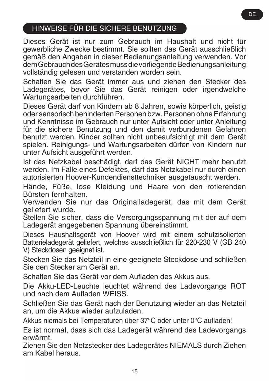 Le nettoyage et l’entretien ne devraient pas être effectués par des enfants sans supervision. Si le cordon d’alimentation est endommagé, arrêtez immédiatement d’utiliser l’appareil. Pour éviter les risques d’accident, un réparateur Hoover agréé doit remplacer le cordon d’alimentation. Maintenez les mains, pieds, vêtements et cheveux à distance des brosses rotatives. Utilisez uniquement le chargeur d’origine qui vous a été fourni avec l’appareil. Vérifiez que la tension de l’alimentation est la même que celle indiquée sur le chargeur. Cet appreil Hoover est fourni avec un chargeur de batterie doublement isolé qui n’est adapté qu’à une prise de 230 V (240 V Grande-Bretagne). Branchez le chargeur dans une prise adaptée et connectez la prise jack du chargeur dans l’appareil. Éteignez l’appareil avant de le charger. Le voyant LED du bloc batterie s’illumine en ROUGE lors de la charge et deviendra BLANC lorsque l’appareil est entièrement chargé. Rebranchez l’appareil au chargeur après l’utilisation pour recharger les batteries. Ne rechargez jamais les batteries dans des températures de plus de 37°C ou en-dessous de 0°C. Il est normal pour le chargeur de devenir chaud au toucher lorsqu’il est en train de charger. Ne pas débrancher en tirant sur le cordon d’alimentation. Débranchez le chargeur en cas d’absence prolongée (vacances, etc.). Rechargez l’appareil de nouveau avant de l’utiliser car les 8