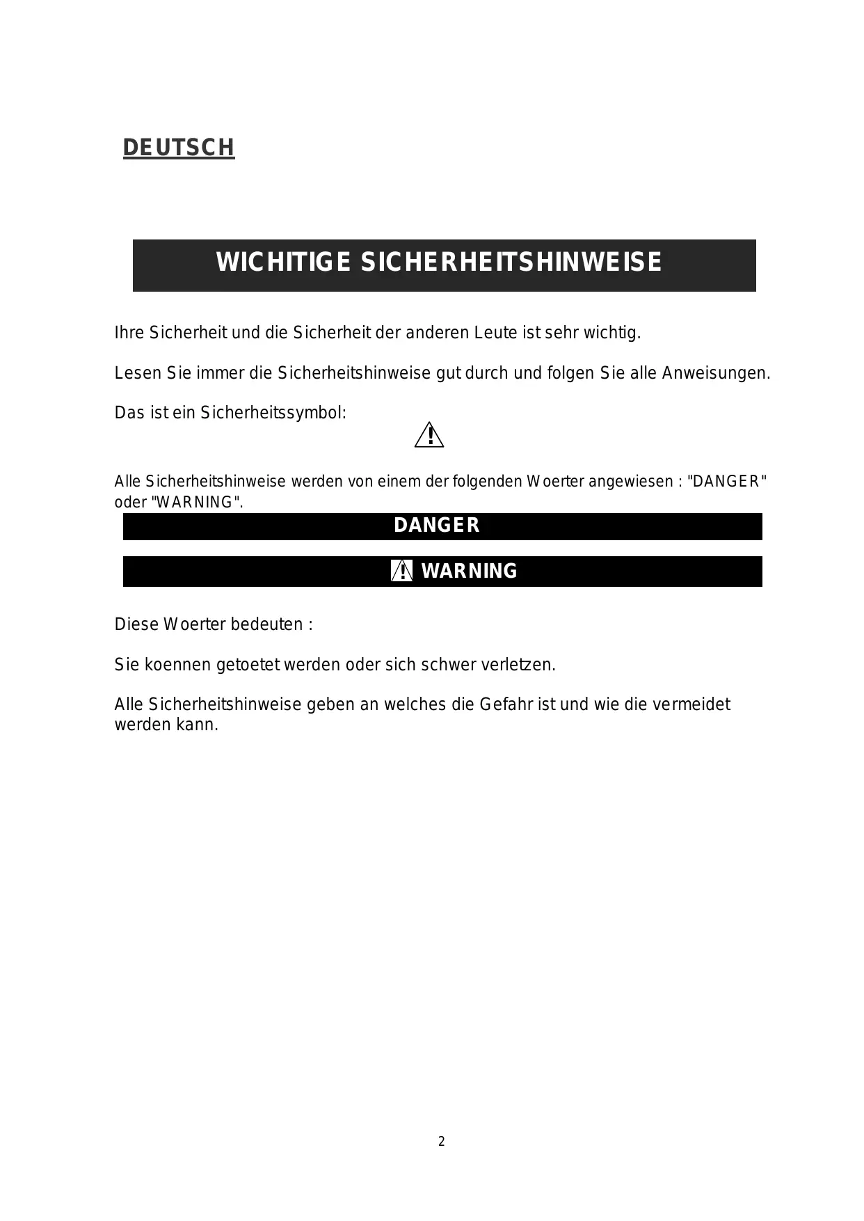 Alle Sicherheitshinweise werden von einem der folgenden Woerter angewiesen : "DANGER" oder "WARNING". DANGER ! WARNING Diese Woerter bedeuten : Sie koennen getoetet werden oder sich schwer verletzen. Alle Sicherheitshinweise geben an welches die Gefahr ist und wie die vermeidet werden kann.