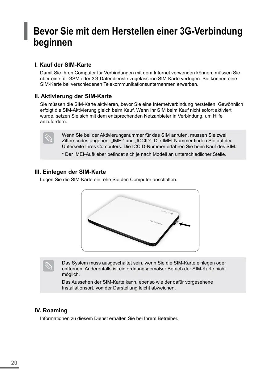 Sie müssen die SIM-Karte aktivieren, bevor Sie eine Internetverbindung herstellen. Gewöhnlich erfolgt die SIM-Aktivierung gleich beim Kauf. Wenn Ihr SIM beim Kauf nicht sofort aktiviert wurde, setzen Sie sich mit dem entsprechenden Netzanbieter in Verbindung, um Hilfe anzufordern. Wenn Sie bei der Aktivierungsnummer für das SIM anrufen, müssen Sie zwei Zifferncodes angeben: „IMEI“ und „ICCID“. Die IMEI-Nummer finden Sie auf der Unterseite Ihres Computers. Die ICCID-Nummer erfahren Sie beim Kauf des SIM.