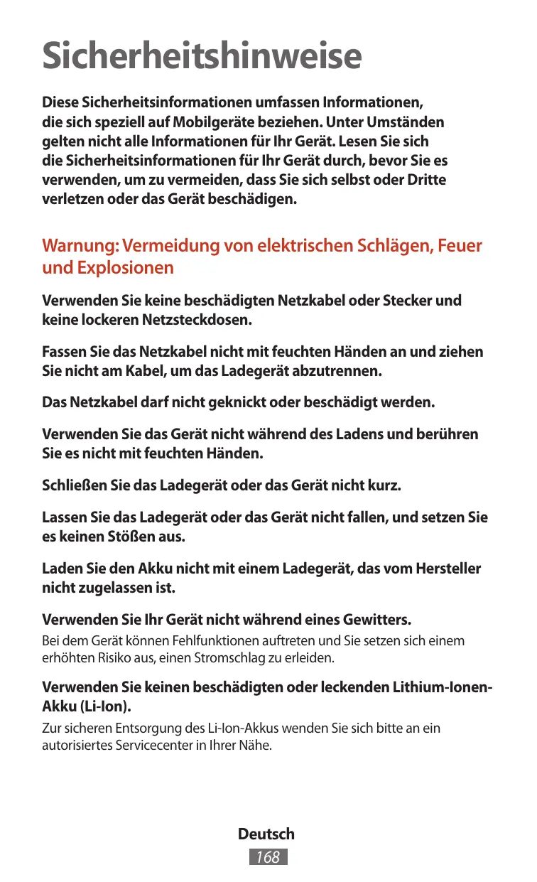 Warnung: Vermeidung von elektrischen Schlägen, Feuer und Explosionen Verwenden Sie keine beschädigten Netzkabel oder Stecker und keine lockeren Netzsteckdosen. Fassen Sie das Netzkabel nicht mit feuchten Händen an und ziehen Sie nicht am Kabel, um das Ladegerät abzutrennen. Das Netzkabel darf nicht geknickt oder beschädigt werden. Verwenden Sie das Gerät nicht während des Ladens und berühren Sie es nicht mit feuchten Händen. Schließen Sie das Ladegerät oder das Gerät nicht kurz. Lassen Sie das Ladegerät oder das Gerät nicht fallen, und setzen Sie es keinen Stößen aus. Laden Sie den Akku nicht mit einem Ladegerät, das vom Hersteller nicht zugelassen ist. Verwenden Sie Ihr Gerät nicht während eines Gewitters. Bei dem Gerät können Fehlfunktionen auftreten und Sie setzen sich einem erhöhten Risiko aus, einen Stromschlag zu erleiden.