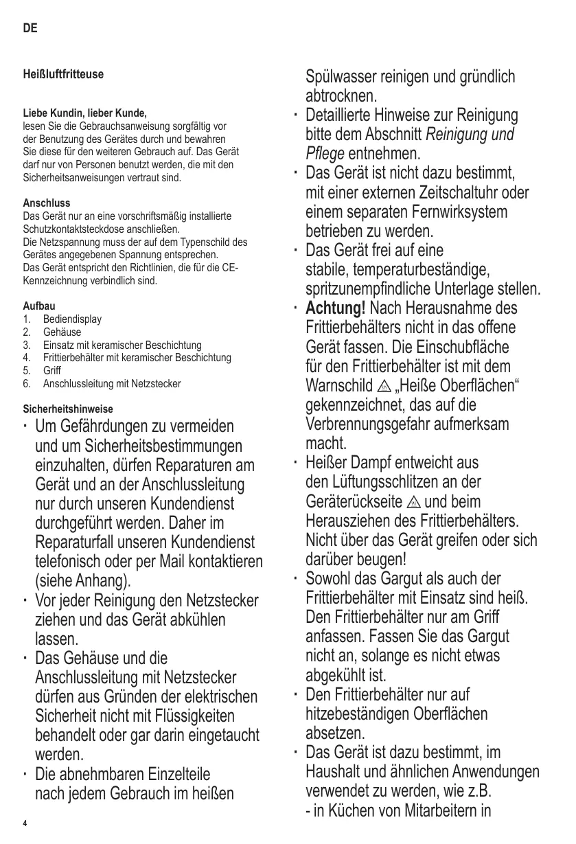 Elementos componentes 1. Pantalla de funcionamiento 2. Carcasa 'Superficies calientes' , que advierte de este peligro. ∙ Cuidado: Al extraer el recipiente de freír, se expulsará vapor caliente. También se expulsará vapor por las ranuras posteriores de ventilación . Mantenga las manos alejadas de la parte superior del aparato y no se incline sobre él. ∙ Los alimentos, el recipiente de freír y la canastilla están calientes. Utilice solo el mango para tocar el recipiente de freír. Espere hasta que los alimentos se hayan enfriado ligeramente para poder tocarlos. ∙ Coloque siempre el recipiente de freír solo sobre una superficie termorresistente. ∙ Este aparato ha sido diseñado para el uso doméstico u otra aplicación similar, por ejemplo - en cocinas de personal, en oficinas y otros puntos comerciales, - en empresas agrícolas,