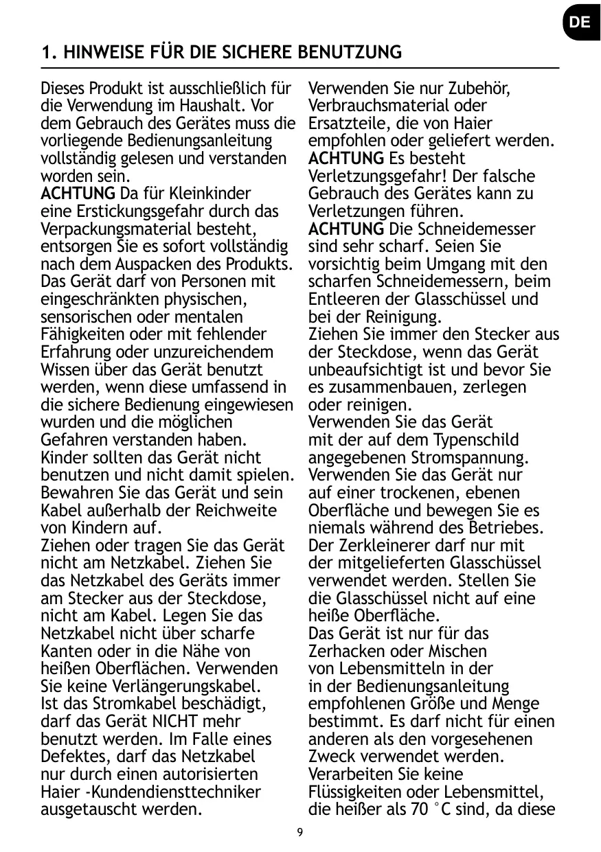 N’utilisez pas l’appareil avec des mains mouillées. Faites attention à la propreté des surfaces destinées à entrer en contact avec les aliments ! Veuillez tenir compte des informations sur le nettoyage dans les instructions. Ne continuez pas à utiliser votre appareil s’il semble défectueux. Haier service : Pour assurer l’utilisation sûre et efficace de cet appareil, nous recommandons de n’en confier l’entretien ou les réparations qu’à un réparateur Haier agréé. AVERTISSEMENT Ne surchargez pas le hacheur. Si vous mettez de la nourriture collante dans le hacheur, n’excédez pas la quantité (max 150 g de beurre + 300 g de miel) et utilisez au maximum pendant 3 secondes avec 2 minutes de pause pendant 3 cycles.