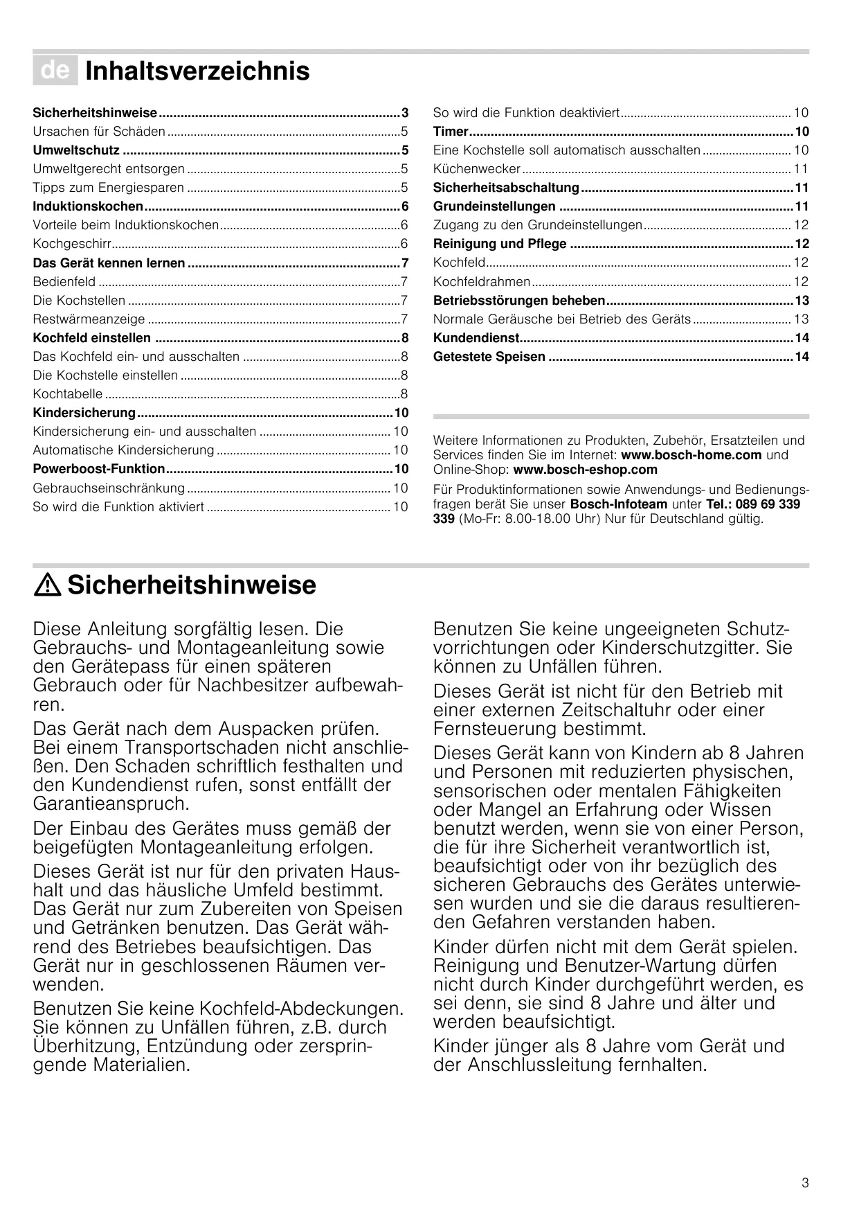 • Getestete Speisen Produktinfo Weitere Informationen zu Produkten, Zubehör, Ersatzteilen und Services finden Sie im Internet: www.bosch-home.com und Online-Shop: www.bosch-eshop.com Für Produktinformationen sowie Anwendungs- und Bedienungsfragen berät Sie unser Bosch-Infoteam unter Tel.: 089 69 339 339 (Mo-Fr: 8.00-18.00 Uhr) Nur für Deutschland gültig. : Sicherheitshinweise Diese Anleitung sorgfältig lesen. Die Gebrauchs- und Montageanleitung sowie den Gerätepass für einen späteren Gebrauch oder für Nachbesitzer aufbewahren. Das Gerät nach dem Auspacken prüfen. Bei einem Transportschaden nicht anschließen. Den Schaden schriftlich festhalten und den Kundendienst rufen, sonst entfällt der Garantieanspruch. Der Einbau des Gerätes muss gemäß der beigefügten Montageanleitung erfolgen. Dieses Gerät ist nur für den privaten Haushalt und das häusliche Umfeld bestimmt. Das Gerät nur zum Zubereiten von Speisen und Getränken benutzen. Das Gerät während des Betriebes beaufsichtigen. Das Gerät nur in geschlossenen Räumen verwenden. Benutzen Sie keine Kochfeld-Abdeckungen. Sie können zu Unfällen führen, z.B. durch Überhitzung, Entzündung oder zerspringende Materialien. Benutzen Sie keine ungeeigneten Schutzvorrichtungen oder Kinderschutzgitter. Sie können zu Unfällen führen. Dieses Gerät ist nicht für den Betrieb mit einer externen Zeitschaltuhr oder einer Fernsteuerung bestimmt. Dieses Gerät kann von Kindern ab 8 Jahren und Personen mit reduzierten physischen, sensorischen oder mentalen Fähigkeiten oder Mangel an Erfahrung oder Wissen benutzt werden, wenn sie von einer Person, die für ihre Sicherheit verantwortlich ist, beaufsichtigt oder von ihr bezüglich des sicheren Gebrauchs des Gerätes unterwiesen wurden und sie die daraus resultierenden Gefahren verstanden haben. Kinder dürfen nicht mit dem Gerät spielen. Reinigung und Benutzer-Wartung dürfen nicht durch Kinder durchgeführt werden, es sei denn, sie sind 8 Jahre und älter und werden beaufsichtigt. Kinder jünger als 8 Jahre vom Gerät und der Anschlussleitung fernhalten. p. 14