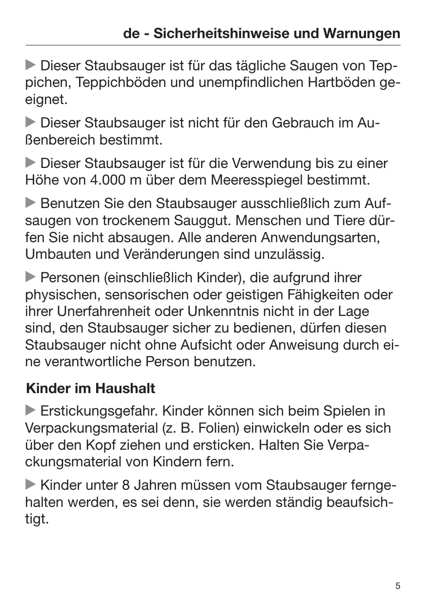  Cet aspirateur ne doit pas être utilisé en extérieur.  Cet aspirateur est conçu pour une utilisation jusqu'à 4000 m d'altitude au-dessus du niveau de la mer.  N'utilisez l'aspirateur que dans le cadre domestique, pour aspirer des poussières sèches. N'utilisez pas cet aspirateur sur les hommes et les animaux. Toute autre application, adaptation ou modification de l'aspirateur est interdite.  Les personnes (y compris les enfants) qui ne sont pas en mesure d'utiliser l'aspirateur en toute sécurité en raison de déficiences physiques, sensorielles ou mentales, de leur inexpérience ou de leur ignorance ne doivent pas utiliser l'aspirateur sans la surveillance ou les instructions d'une personne responsable.