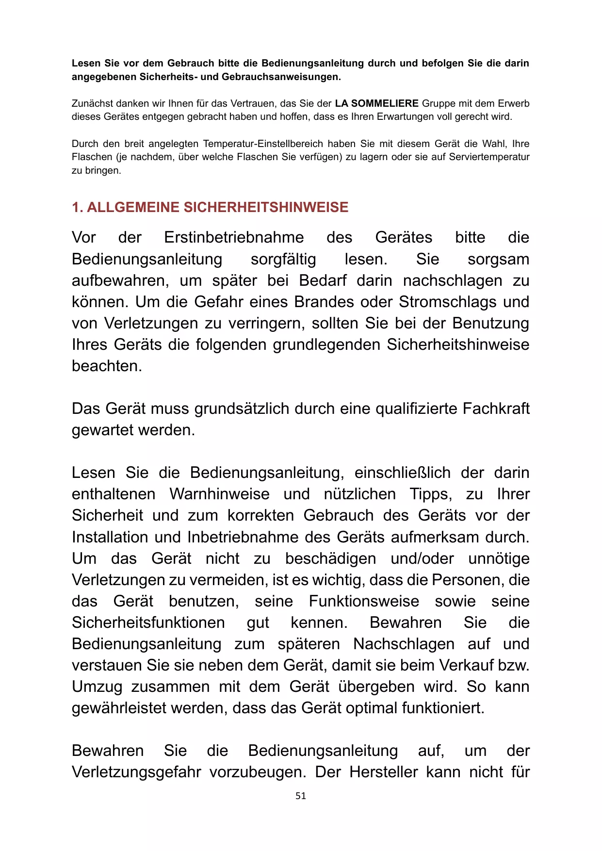 D'une manière générale, votre appareil doit être entretenu par un professionnel qualifié. Pour votre sécurité et pour une utilisation correcte de l’appareil, avant d’installer et d’utiliser l’appareil pour la première fois, lisez attentivement cette notice, y compris les mises en garde et les conseils utiles qu’elle contient. Afin d’éviter d’endommager l’appareil et/ou de vous blesser inutilement, il est important que les personnes amenées à utiliser cet appareil aient pris entièrement connaissance de son fonctionnement ainsi que de ses instructions de sécurité. Conservez ces consignes pour plus tard et pensez à les ranger à côté de l’appareil, afin qu’elles soient transmises avec ce dernier en cas de vente ou de déménagement. Cela permettra de garantir un fonctionnement optimal de l’appareil. Pour éviter tout risque de blessure, conservez cette notice. Le fabricant ne saurait en effet être tenu responsable en cas de mauvaise manipulation de l’appareil. Cet appareil est destiné exclusivement à un usage domestique et est prévu pour le stockage de boissons spéciales à une 1