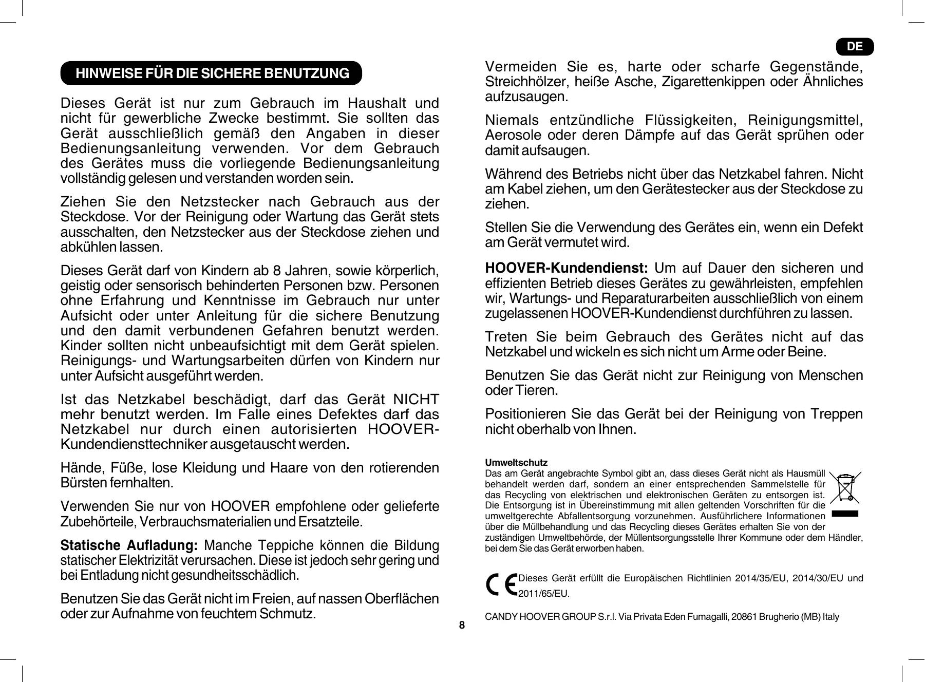 Le symbole figurant sur cet appareil indique qu’il ne peut pas être considéré comme une ordures ménagères. Vous devez le déposer dans un centre de recyclage des déchets électriques et électroniques. La déposition doit être effectuée conformément à la réglementation locale en matière de déchets. Pour obtenir des compléments d’information sur le traitement, la récupération et le recyclage de cet appareil, veuillez contacter votre municipalité, le service local d’élimination des ordures ménagères ou le revendeur de l’appareil. Cet appareil est conforme aux Directives européennes 2014/35/UE, 2014/30/UE et 2011/65/UE. CANDY HOOVER GROUP S.r.l. Via Privata Eden Fumagalli, 20861 Brugherio (MB) Italy