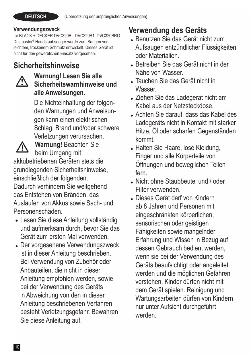 Ihr BLACK + DECKER DVC320B, DVC320B1, DVC320BRG Dustbuster® Handstaubsauger wurde zum Saugen von leichtem, trockenem Schmutz entwickelt. Dieses Gerät ist nicht für den gewerblichen Einsatz vorgesehen.