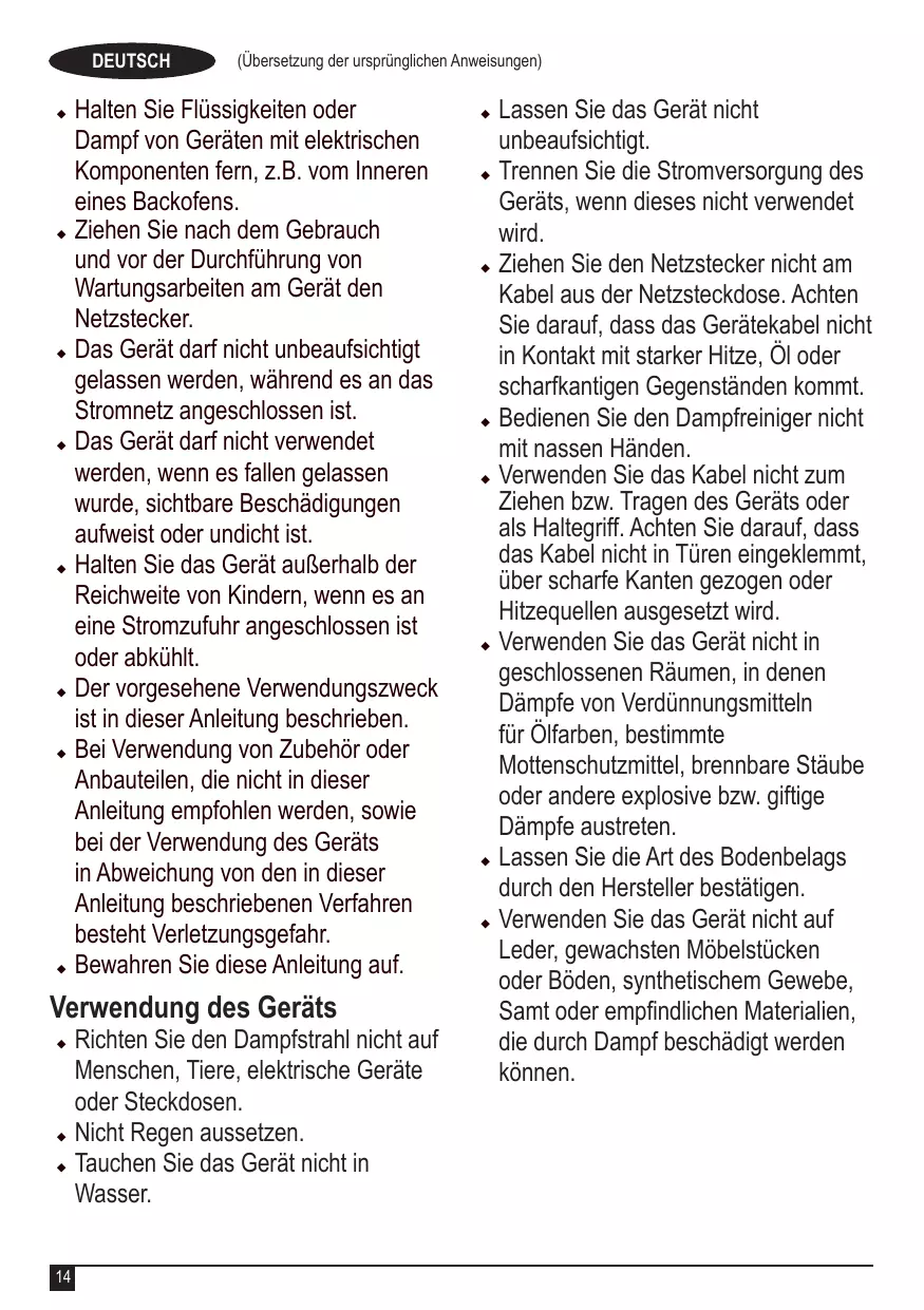 (Übersetzung der ursprünglichen Anweisungen) Sobald das Wasser die benötigte Temperatur erreicht hat, drücken Sie die gewünschte Dampfeinstellungstaste, um den Dampfstrom zu starten. u Es dauert einige Sekunden, bis der Dampf das Bodentuch durchdringt. Anschließend gleitet der Dampfreiniger mühelos über die zu reinigende Oberfläche. u Bewegen Sie den Dampfreiniger langsam über die Oberfläche, um alle Bereiche gründlich zu reinigen. u Wenn Sie mit der Arbeit mit dem Dampfreiniger fertig sind, drücken Sie die Dampfausgabetaste, um die Dampfausgabe zu beenden, bringen das Gerät in die aufrechte Stellung, so dass es abgestützt ist, und schalten es AUS. Warten Sie, bis der Dampfreiniger abgekühlt ist (etwa 5 Minuten). Vorsicht! Achten Sie stets auf den Wasserpegel im Tank. Bewegen Sie den Dampfreiniger in die aufrechte Stellung, so dass es abgestützt ist, und schalten Sie das Gerät aus, um den Wassertank aufzufüllen und mit dem Reinigen fortzufahren. Trennen Sie das Gerät von der Stromversorgung und befüllen Sie den Wassertank. Vorsicht! Stellen Sie den Dampfreiniger – ungeachtet der jeweiligen Oberfläche – keinesfalls längere Zeit an einer Stelle ab. Stellen Sie den Dampfreiniger stets in aufrechter Stellung ab. Stellen Sie sicher, dass der Dampfreiniger ausgeschaltet ist, wenn dieser nicht verwendet wird. u