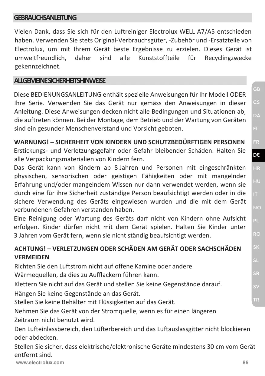 SR Ne montez pas et ne placez pas d’objets sur l’appareil. SV Ne suspendez pas d’objets à l’appareil. Ne placez pas de récipients contenant des liquides sur l’appareil. TR Éteignez l’appareil à la source d’alimentation lorsqu’il n’est pas utilisé pendant une période prolongée. Ne bloquez pas ou ne recouvrez pas la zone d’entrée d’air, la zone du ventilateur et la grille de sortie d’air. Assurez-vous que tout équipement électrique/électronique se trouve à au moins 30 cm de l’appareil. www.electrolux.com