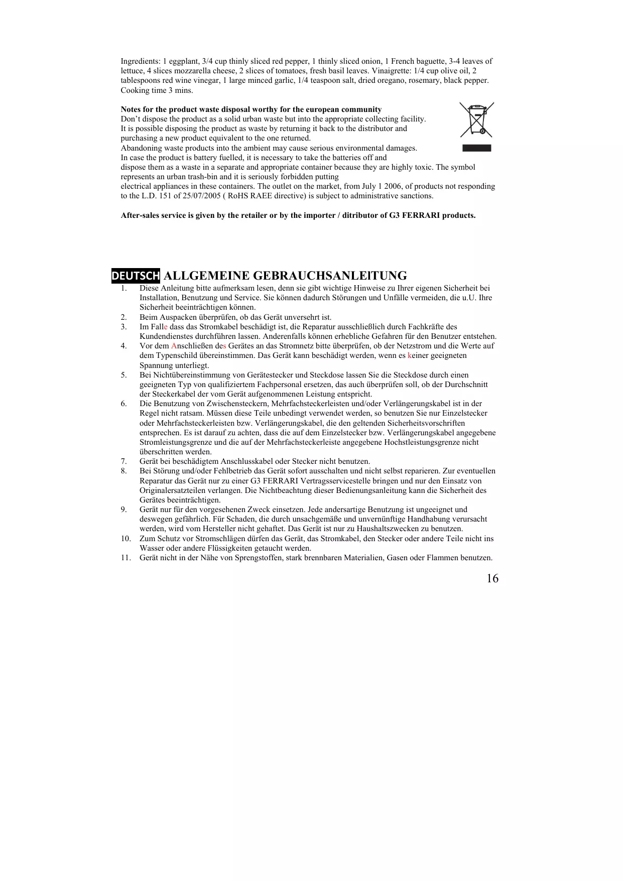 Les batteries doivent être écoulées séparément dans autres récipients spéciaux puisque elles contennent des composants hautement poullantes. Le symbole représenté en figure représente la boîte à ordures urbains. Il est formellement interdit de jeter l’appareil dans ces conteneurs. L’introduction sur le marché des produits pas conformes au DLgs 151 du 25.07.05 (Directive RoHS RAEE) après le 1 Juillet 2006, est sanctionnée administrativement. Le service après-vente est effectué par votre revendeur ou par l’importateur/distributeur des produits G3 FERRARI.