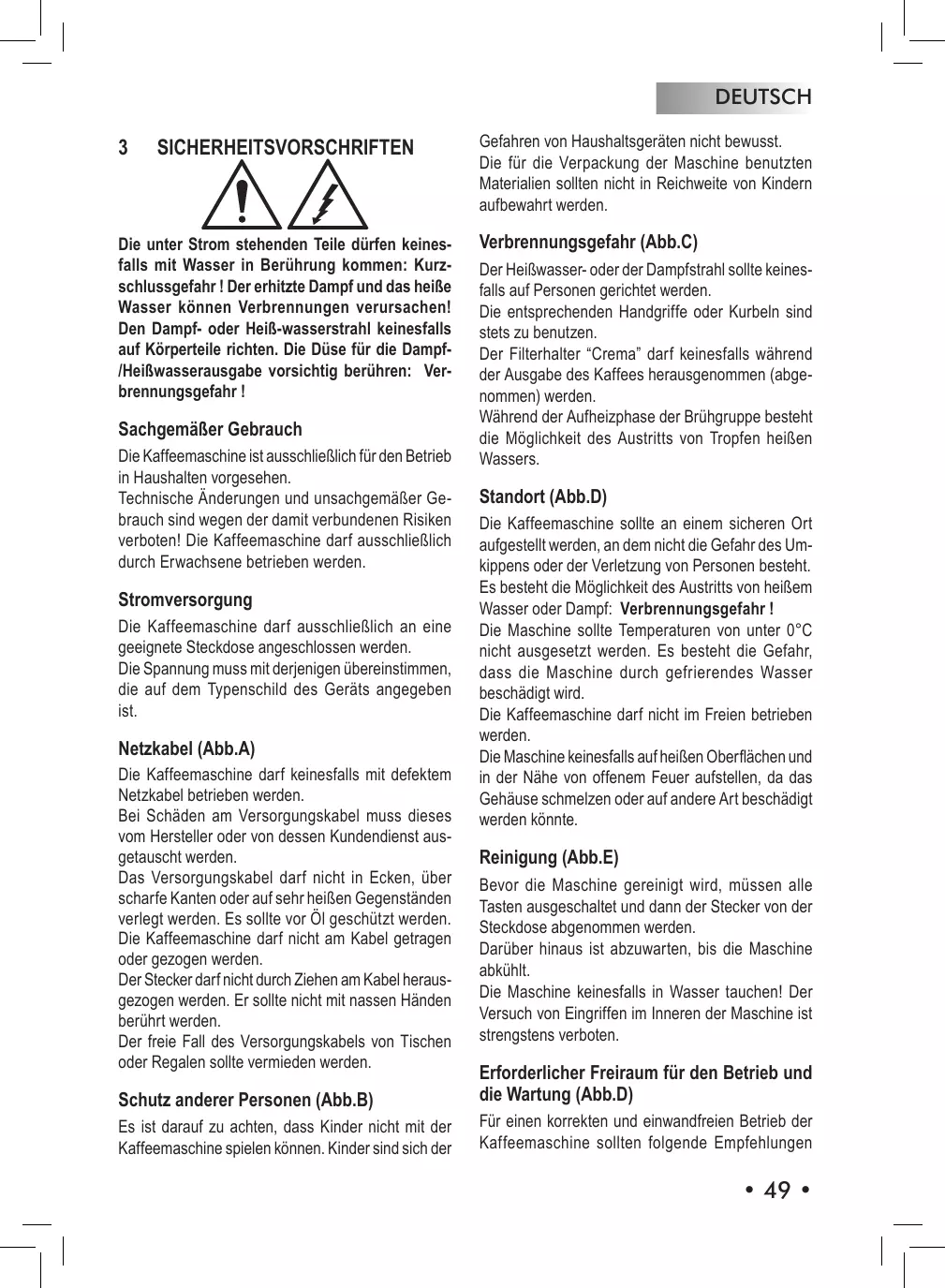 Verbrennungsgefahr (Abb.C) Der Heißwasser- oder der Dampfstrahl sollte keinesfalls auf Personen gerichtet werden. Die entsprechenden Handgriffe oder Kurbeln sind stets zu benutzen. Der Filterhalter “Crema” darf keinesfalls während der Ausgabe des Kaffees herausgenommen (abgenommen) werden. Während der Aufheizphase der Brühgruppe besteht die Möglichkeit des Austritts von Tropfen heißen Wassers.