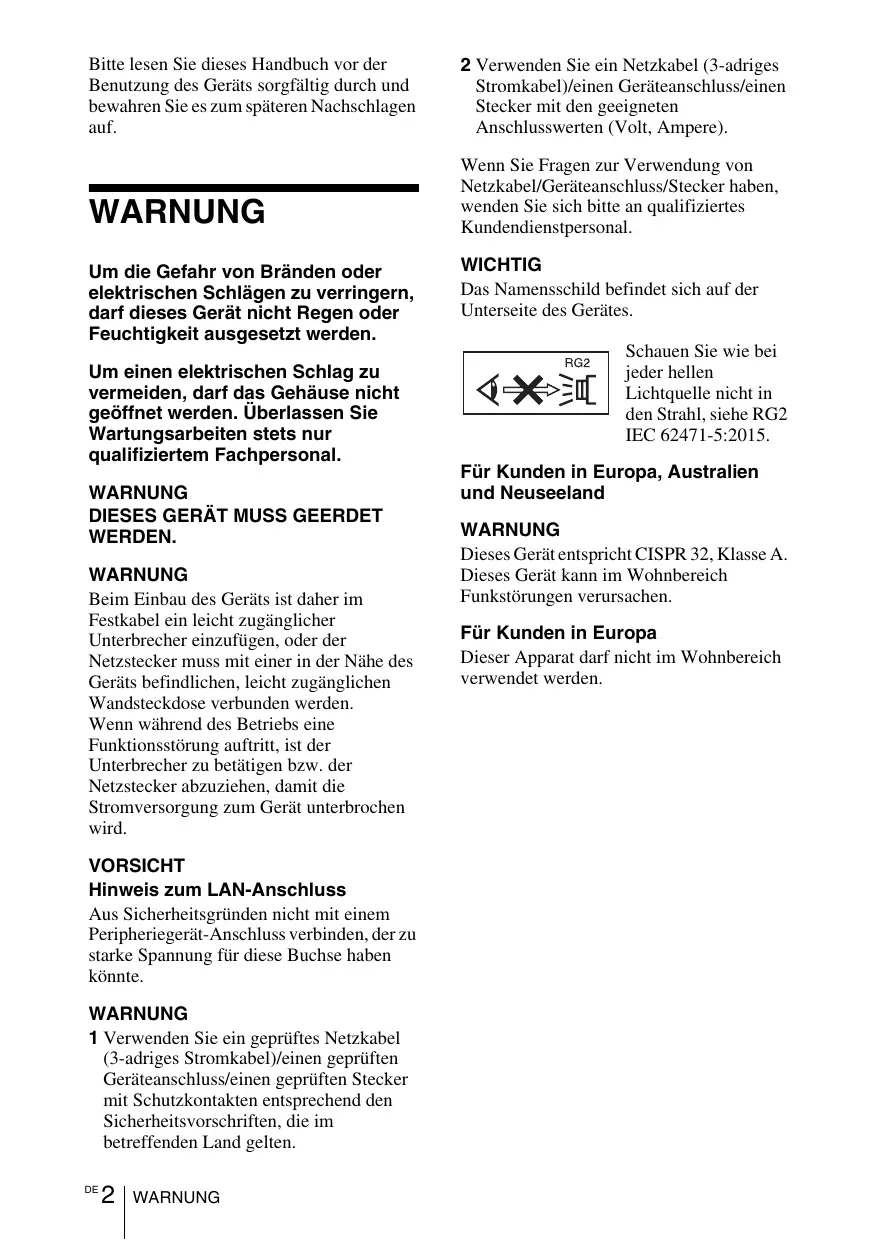 WARNUNG WICHTIG Das Namensschild befindet sich auf der Unterseite des Gerätes. Schauen Sie wie bei jeder hellen Lichtquelle nicht in den Strahl, siehe RG2 IEC 62471-5:2015. Für Kunden in Europa, Australien und Neuseeland WARNUNG Dieses Gerät entspricht CISPR 32, Klasse A. Dieses Gerät kann im Wohnbereich Funkstörungen verursachen. Für Kunden in Europa Dieser Apparat darf nicht im Wohnbereich verwendet werden.
