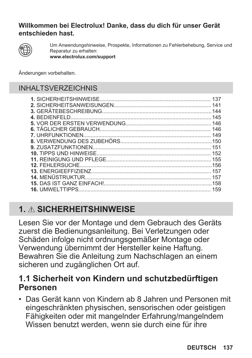 1. INFORMATION SUR LA SÉCURITÉ 114 2. CONSIGNES DE SÉCURITÉ117 3. DESCRIPTION DE L'APPAREIL120 4. BANDEAU DE COMMANDE121 5. AVANT LA PREMIÈRE UTILISATION 122 6. UTILISATION QUOTIDIENNE 123 7. FONCTIONS DE L'HORLOGE126 8. UTILISATION DES ACCESSOIRES127 9. FONCTIONS SUPPLÉMENTAIRES 128 10. CONSEILS 128 11. ENTRETIEN ET NETTOYAGE 132 1.1 Sécurité des enfants et des personnes vulnérables • Cet appareil peut être utilisé par des enfants âgés d'au moins 8 ans et par des personnes ayant des capacités physiques, sensorielles ou mentales réduites ou dénuées d’expérience ou de connaissance, s'ils sont correctement 114