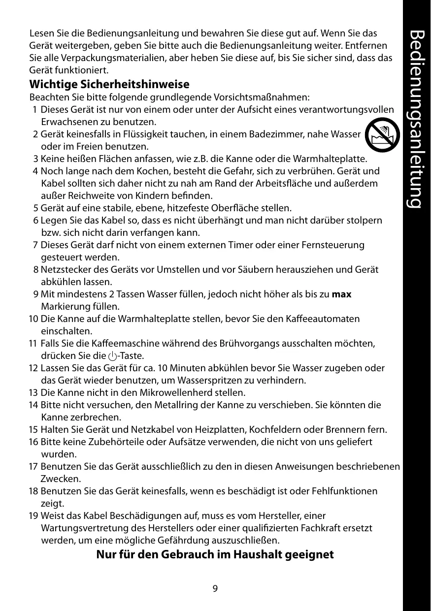 3 Ne touchez pas les surfaces chaudes ( la carafe, la plaque chauffante). 4 Le risque de brûlure persiste longtemps après ébullition. Tenez l’appareil et le câble loin des bords des surfaces de travail et hors de portée des enfants. 5 Posez l’appareil sur une surface stable, à niveau et résistante à la chaleur. 6 Branchez le cordon de sorte qu’il ne pende pas et qu’il n’y ait aucun risque de trébucher dessus. 7 Cet appareil ne doit pas être utilisé avec un minuteur externe ou un système de contrôle à distance. 8 Débranchez l’appareil lorsque vous ne l’utilisez pas, avant de le déplacer et avant de le nettoyer. 9 Remplissez le réservoir avec 2 tasses au minimum, mais sans dépasser la marque max. 10 Placez la carafe sur la plaque chauffante avant d’allumer la cafetière. 11 Si vous voulez arrêter la machine pendant la préparation du café, appuyez sur le bouton 2. 12 Laissez l’appareil refroidir au moins 10 minutes avant de rajouter de l’eau ou de le réutiliser afin d’éviter toute projection. 13 Ne mettez pas la carafe au four micro-ondes. 14 N’essayez pas de régler la bande métallique autour de la carafe, le verre casserait. 15 Placez l’appareil et le cordon loin des plaques chauffantes, des plans de cuisson ou des brûleurs. 16 N’adaptez pas d’accessoires autres que ceux fournis. 17 N’utilisez pas l’appareil à d’autres fins que celles décrites dans ce mode d’emploi. 18 N’utilisez pas l’appareil s’il est endommagé ou s’il ne fonctionne pas correctement. 19 Si le câble est abîmé, vous devez le faire remplacer par le fabricant, un de ses techniciens agréés ou une personne également qualifiée, pour éviter tout danger.