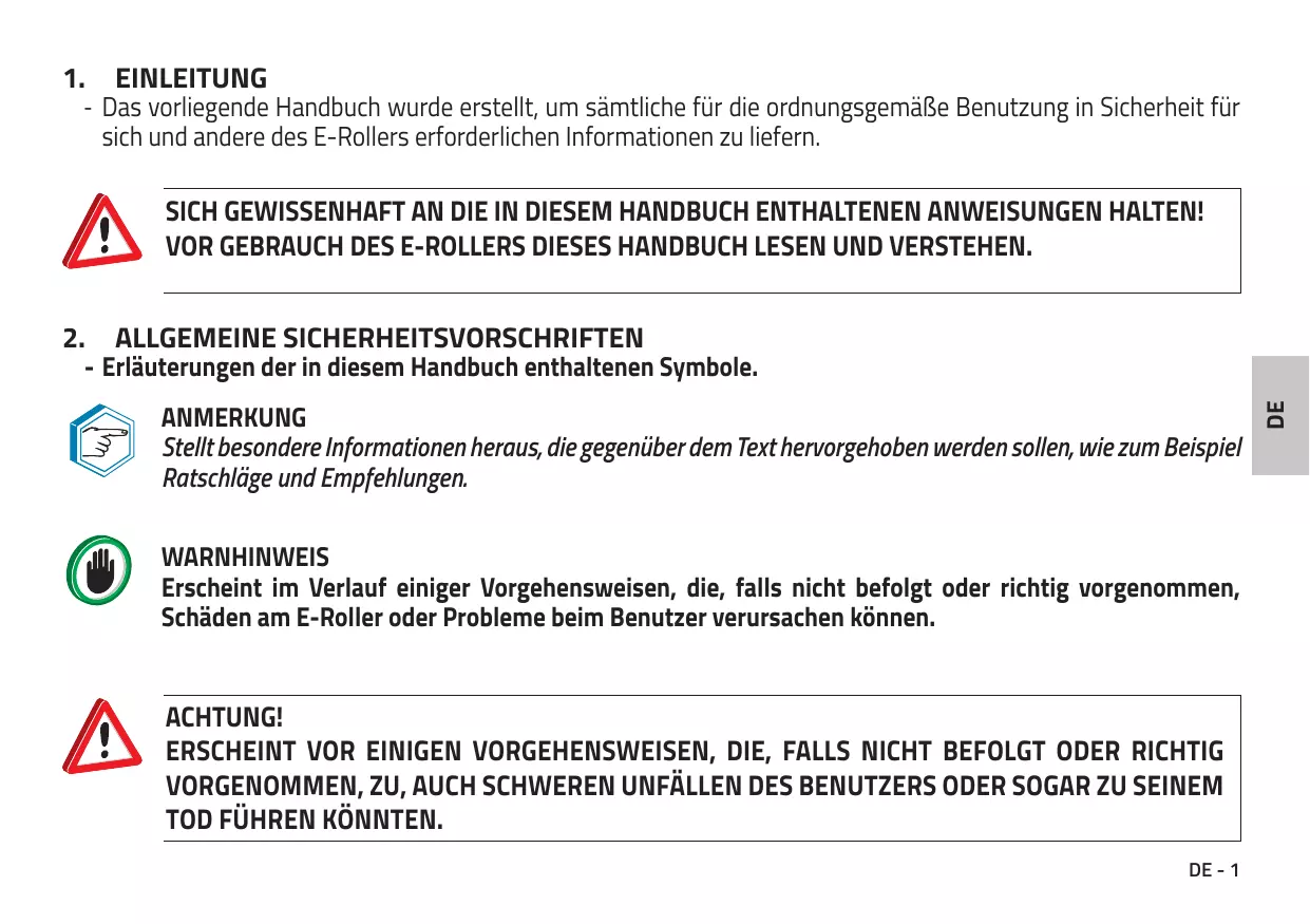 APPARAÎT AVANT CERTAINES PROCÉDURES QUI, SI ELLES NE SONT PAS SUIVIES OU EXÉCUTÉES CORRECTEMENT, PEUVENT ENTRAÎNER DES BLESSURES, VOIRE LA MORT. DE FR IT - 1 • Vérifier l’intégrité mécanique de la trottinette avant chaque utilisation. En cas d’anomalies, de fissures ou d’autres signes de détérioration, ne pas utiliser la trottinette et la faire vérifier par le concessionnaire ou par du personnel qualifié et autorisé. • Le non-respect des instructions figurant dans ce manuel d’instructions expose l’utilisateur au risque de chute ou de heurt vis-à-vis d’autres personnes ou objets, avec des conséquences qui pourraient également être graves. • Pour éviter les blessures, ce manuel contient des symboles (décrits au paragraphe « 2 ») utilisés pour mettre les mesures de sécurité en évidence. Les avertissements accompagnant ces symboles doivent toujours être attentivement suivis. • L’utilisation de la trottinette par des personnes âgées de 14 à 18 ans nécessite l’utilisation obligatoire d’un casque homologué correctement porté (vérifier la limite d’âge légal du lieu d’utilisation). Toutefois, il est recommandé de TOUJOURS utiliser un casque et autres équipements de protection individuelle tels que des genouillères, des coudières et des gants. Il est recommandé de porter des chaussures plates. IT --22 DE FR