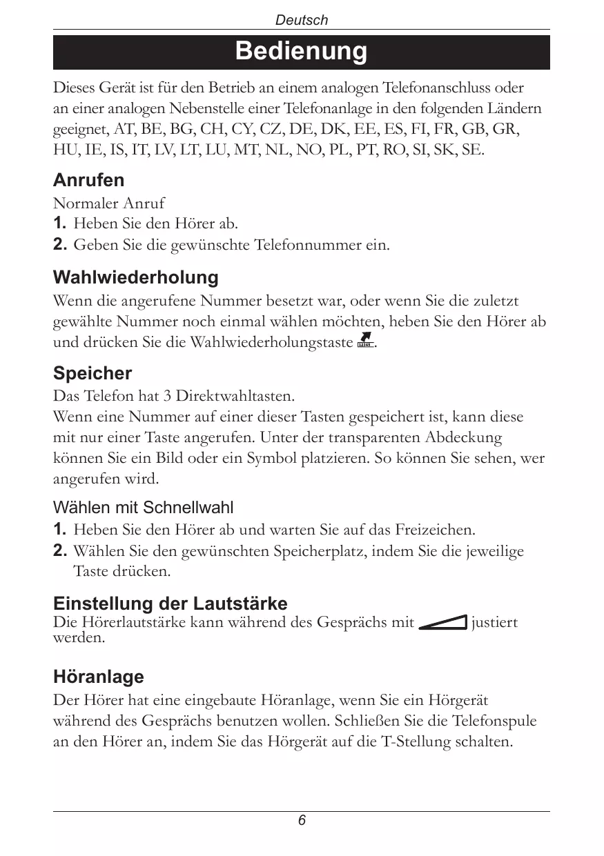 Deutsch Bedienung Dieses Gerät ist für den Betrieb an einem analogen Telefonanschluss oder an einer analogen Nebenstelle einer Telefonanlage in den folgenden Ländern geeignet, AT, BE, BG, CH, CY, CZ, DE, DK, EE, ES, FI, FR, GB, GR, HU, IE, IS, IT, LV, LT, LU, MT, NL, NO, PL, PT, RO, SI, SK, SE. Anrufen Normaler Anruf