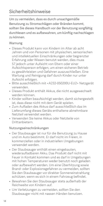 • Ce produit peut être utilisé par des enfants à partir de 8 ans, ainsi que des personnes présentant des déficiences physiques, sensorielles ou intellectuelles, ou dont l’expérience et les connaissances sont limitées sous le contrôle d’un parent ou d’un tuteur pour assurer une utilisation sécurisée et éviter tout danger. Le nettoyage et l’entretien ne doivent pas être effectués par des enfants sans surveillance. • N’utilisez que l’unité d’approvisionnement <A232050200U-EU2>. • Cet appareil contient des batteries ne pouvant être remplacées que par des personnes compétentes. • Ce produit contient des piles non remplaçables. • Pour charger la batterie, utilisez uniquement l'unité d'approvisionnement amovible fournie avec cet appareil. • N’utilisez pas de batterie, d’adaptateur d’alimentation ou de socle de charge tiers. Restrictions d’utilisation • L’aspirateur est destiné uniquement à être utilisé à domicile et dans un véhicule. Ne l’utilisez pas à l’extérieur, sous la pluie ni dans des environnements industriels. • L’aspirateur contient une batterie intégrée rechargeable. N’exposez pas l’aspirateur au feu et ne le chargez pas, ne l’utilisez pas ou ne l’entreposez pas dans un environnement à température élevée. Afin d’empêcher une surchauffe et un risque d'incendie ou d explosion, placez l’aspirateur à l’abri du soleil lorsqu'il est stocké dans un véhicule. • Gardez toujours l’aspirateur hors de la portée des enfants. • Afin d’éviter le risque de blessure, n’utilisez pas l’aspirateur avec les mains mouillées. 39