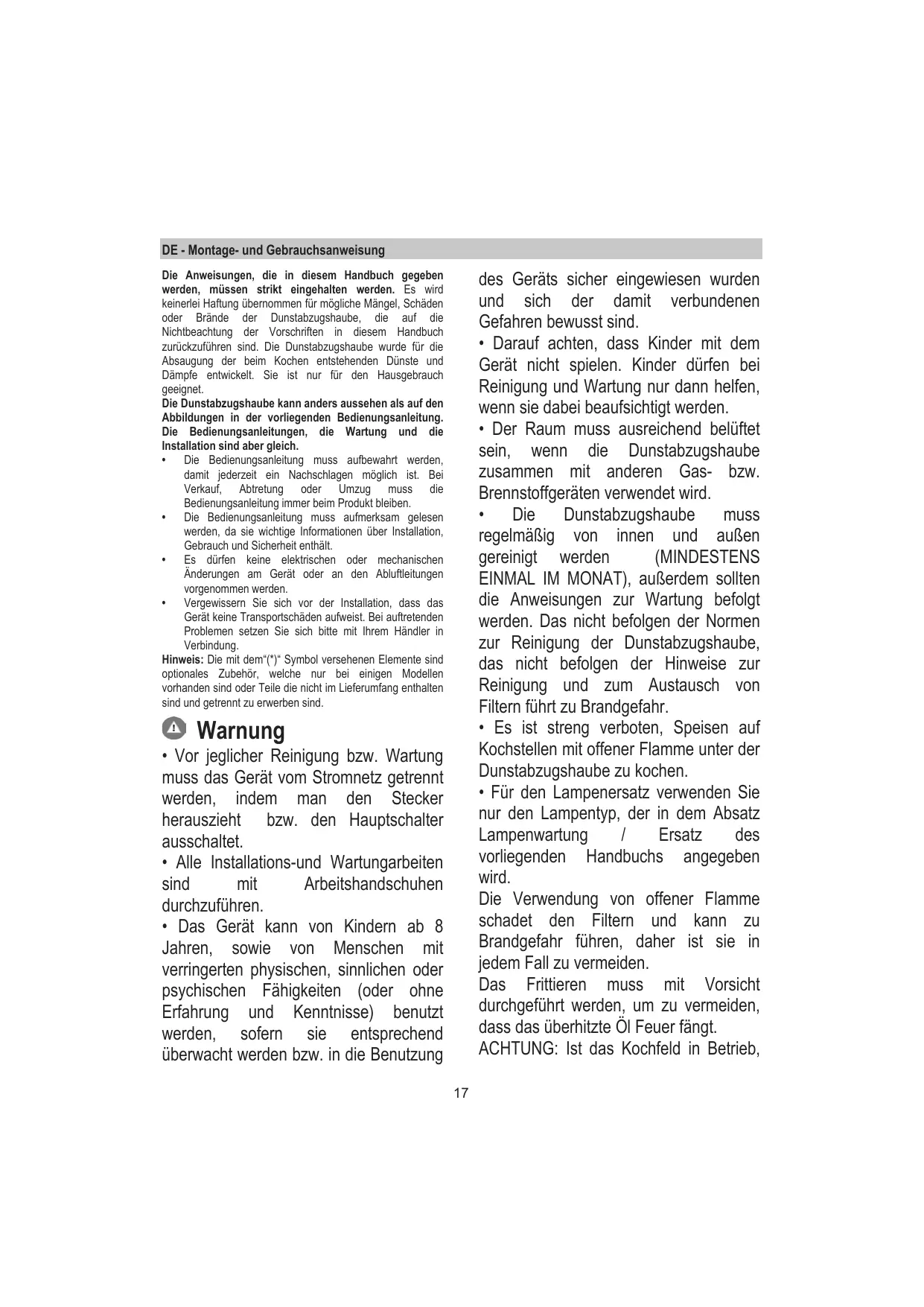 • Les enfants ne doivent pas jouer avec l’appareil. • Le nettoyage et l’entretien par l’usager ne doivent pas être effectués par des enfants sans surveillance. • La pièce doit avoir une aération suffisante lorsque la hotte est utilisée conjointement avec d'autres appareils fonctionnant au gaz ou autres combustibles. • La hotte doit être régulièrement nettoyée à la fois à l'intérieur et à l'extérieur (AU MOINS UNE FOIS PAR MOIS); cela devrait se faire en conformité avec les instructions d'entretien. Le non respect des instructions expressément fournies concernant le nettoyage de la hotte et des filtres peut provoquer des risques d'incendie. • Ne pas flamber d’aliments sous la hotte. • Pour le remplacement de la lampe, utilisez uniquement le type de lampe spécifié dans la section remplacement/maintenance lampe dans ce manuel. L'utilisation d'une flamme nue est dommageable pour les filtres et peut causer un incendie, par conséquent, il est déconseillé de l'utiliser. La friture doit être faite avec soin afin de s’assurer que l’huile surchauffée ne prenne pas feu. AVERTISSEMENT: Lorsque la table de cuisson est en fonctionnement, les parties accessibles de la hotte peuvent