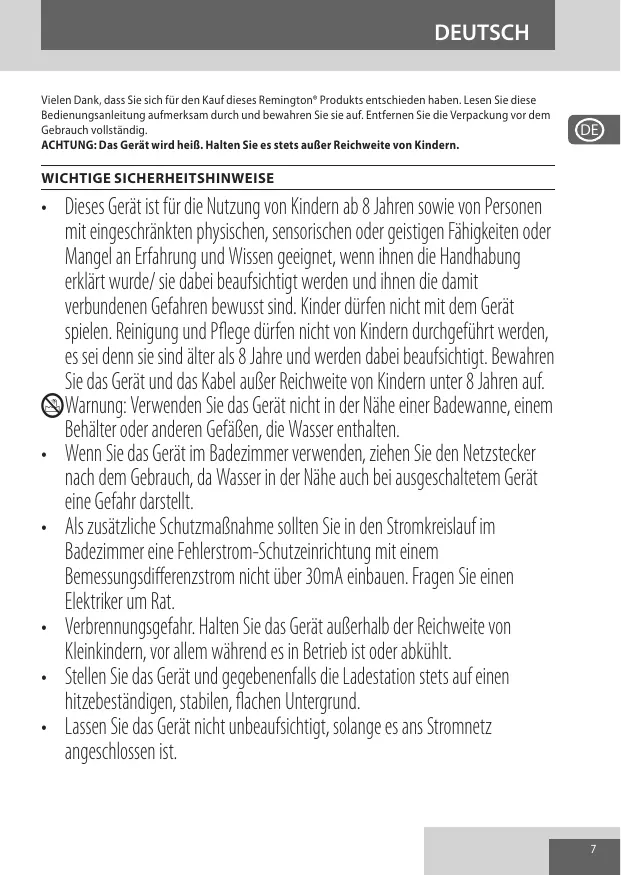 Tenez l’appareil et le câble hors de portée des enfants de moins de 8 ans. L Avertissement : Veillez à ne pas utiliser cet appareil à proximité de baignoires, douches, lavabos ou autres récipients contenant de l’eau. • Lorsque l’appareil est utilisé dans une salle de bains, débranchez-le après usage. La proximité de l’eau présente un danger même lorsque l’appareil est éteint. • Pour une protection supplémentaire, l’installation de courant résiduel (RCD)avec un differentiel residuel nominal ne dépassant pas 30mA est recommandée. Demandez de l’aide à un électricien. • Risque de brûlure. Veillez à maintenir l’appareil hors de portée des jeunes enfants, en particulier lorsque vous utilisez l’appareil et lorsqu’il refroidit. • Placez toujours l’appareil avec son support, le cas échéant, sur une surface plate, stable et résistante à la chaleur. • Ne laissez en aucun cas l’appareil sans surveillance quand il est connecté au réseau électrique. • Si le cordon d’alimentation de cet appareil est endommagé, cessez immédiatement d’utiliser l’appareil et renvoyez-le au service consommateurs Remington agréé le plus proche en vue de sa réparation ou de sa substitution afin d’éviter tout risque.
