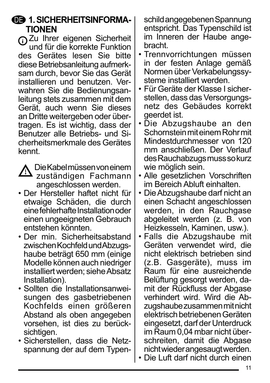 • Pour les appareils de Classe I, s’assurer que l’installation électrique de votre intérieur dispose d’une mise à la terre adéquate. Reliez l’aspirateur du conduit de cheminée avec un tube ayant un diamètre minimum de 120 mm. Le parcours des fumées doit être le plus court possible. Respecter toutes les normes concernant l’évacuation de l’air. Ne reliez pas la hotte aspirante aux conduits de cheminée qui acheminent les fumées de combustion (par ex. de chaudières, de cheminées, etc.). Si vous utilisez l’aspirateur en même temps que des appareils non électriques (par ex. fonctionnant au gaz), veillez à ce que la pièce soit adéquatement ventilée, afin d’empêcher le retour du flux des gaz d’évacuation. Si vous utilisez la hotte de cuisine en même temps que des appareils non alimentés à l’électricité, la pression négative dans la pièce ne doit pas dépasser 0,04 mbar, afin d’éviter que les fumées soient réaspirées dans la pièce où se trouve la hotte. Ne pas évacuer l’air à travers 15