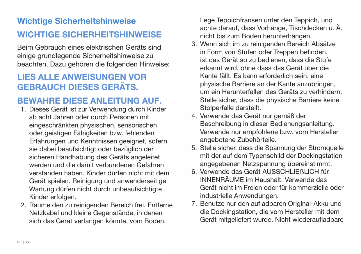 Lege Teppichfransen unter den Teppich, und achte darauf, dass Vorhänge, Tischdecken u. Ä. nicht bis zum Boden herunterhängen. 3. Wenn sich im zu reinigenden Bereich Absätze in Form von Stufen oder Treppen befinden, ist das Gerät so zu bedienen, dass die Stufe erkannt wird, ohne dass das Gerät über die Kante fällt. Es kann erforderlich sein, eine physische Barriere an der Kante anzubringen, um ein Herunterfallen des Geräts zu verhindern. Stelle sicher, dass die physische Barriere keine Stolperfalle darstellt. 4. Verwende das Gerät nur gemäß der Beschreibung in dieser Bedienungsanleitung. Verwende nur empfohlene bzw. vom Hersteller angebotene Zubehörteile. 5. Stelle sicher, dass die Spannung der Stromquelle mit der auf dem Typenschild der Dockingstation angegebenen Netzspannung übereinstimmt. 6. Verwende das Gerät AUSSCHLIEẞLICH für INNENRÄUME im Haushalt. Verwende das Gerät nicht im Freien oder für kommerzielle oder industrielle Anwendungen. 7. Benutze nur den aufladbaren Original-Akku und die Dockingstation, die vom Hersteller mit dem Gerät mitgeliefert wurde. Nicht wiederaufladbare