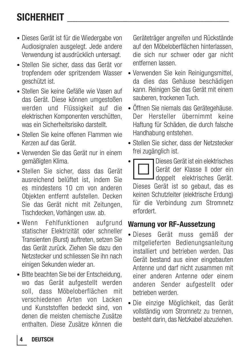 SICHERHEIT_________________________________ Dieses Gerät ist für die Wiedergabe von Audiosignalen ausgelegt. Jede andere Verwendung ist ausdrücklich untersagt. • Stellen Sie sicher, dass das Gerät vor tropfendem oder spritzendem Wasser geschützt ist. • Stellen Sie keine Gefäße wie Vasen auf das Gerät. Diese können umgestoßen werden und Flüssigkeit auf die elektrischen Komponenten verschütten, was ein Sicherheitsrisiko darstellt. • Stellen Sie keine offenen Flammen wie Kerzen auf das Gerät. • Verwenden Sie das Gerät nur in einem gemäßigten Klima. • Stellen Sie sicher, dass das Gerät ausreichend belüftet ist, indem Sie es mindestens 10 cm von anderen Objekten entfernt aufstellen. Decken Sie das Gerät nicht mit Zeitungen, Tischdecken, Vorhängen usw. ab. • Wenn Fehlfunktionen aufgrund statischer Elektrizität oder schneller Transienten (Burst) auftreten, setzen Sie das Gerät zurück. Ziehen Sie dazu den Netzstecker und schliessen Sie ihn nach einigen Sekunden wieder an. • Bitte beachten Sie bei der Entscheidung, wo das Gerät aufgestellt werden soll, dass Möbeloberflächen mit verschiedenen Arten von Lacken und Kunststoffen bedeckt sind, von denen die meisten chemische Zusätze enthalten. Diese Zusätze können die •