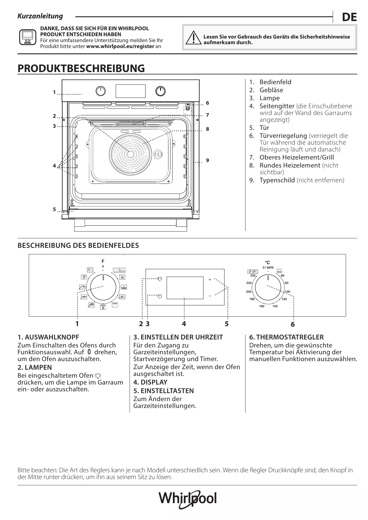 DE Kurzanleitung DANKE, DASS SIE SICH FÜR EIN WHIRLPOOL PRODUKT ENTSCHIEDEN HABEN Für eine umfassendere Unterstützung melden Sie Ihr Produkt bitte unter www.whirlpool.eu/register an