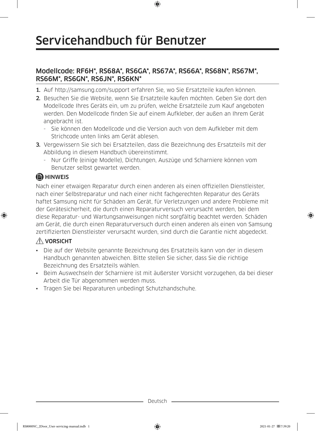 Servicehandbuch für Benutzer Modellcode: RF6H*, RS68A*, RS6GA*, RS67A*, RS66A*, RS68N*, RS67M*, RS66M*, RS6GN*, RS6JN*, RS6KN* 1. Auf http://samsung.com/support erfahren Sie, wo Sie Ersatzteile kaufen können. 2. Besuchen Sie die Website, wenn Sie Ersatzteile kaufen möchten. Geben Sie dort den Modellcode Ihres Geräts ein, um zu prüfen, welche Ersatzteile zum Kauf angeboten werden. Den Modellcode finden Sie auf einem Aufkleber, der außen an Ihrem Gerät angebracht ist. - Sie können den Modellcode und die Version auch von dem Aufkleber mit dem Strichcode unten links am Gerät ablesen. 3. Vergewissern Sie sich bei Ersatzteilen, dass die Bezeichnung des Ersatzteils mit der Abbildung in diesem Handbuch übereinstimmt. - Nur Griffe (einige Modelle), Dichtungen, Auszüge und Scharniere können vom Benutzer selbst gewartet werden. HINWEIS Nach einer etwaigen Reparatur durch einen anderen als einen offiziellen Dienstleister, nach einer Selbstreparatur und nach einer nicht fachgerechten Reparatur des Geräts haftet Samsung nicht für Schäden am Gerät, für Verletzungen und andere Probleme mit der Gerätesicherheit, die durch einen Reparaturversuch verursacht werden, bei dem diese Reparatur- und Wartungsanweisungen nicht sorgfältig beachtet werden. Schäden am Gerät, die durch einen Reparaturversuch durch einen anderen als einen von Samsung zertifizierten Dienstleister verursacht wurden, sind durch die Garantie nicht abgedeckt. VORSICHT •