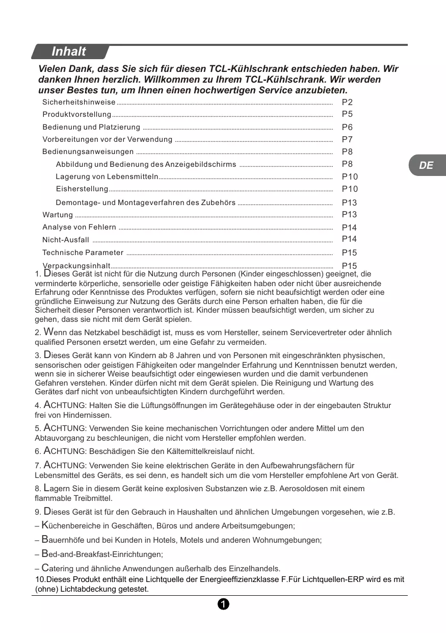 2. S i le cordon d’alimentation est endommagé, il doit être remplacé par le fabricant, son agent de service ou tout autre personne qualifiée similaire dans le but d’éviter tout danger. 3. C et appareil peut être utilisé par des enfants âgés de 8 ans et plus ainsi que par les personnes à capacités physiques, sensorielles ou mentales réduits ou manquant d’expériences et de connaissances étant surveillées ou ayant reçu des instructions concernant l’utilisation de l’appareil de manière sûre et comprenant les dangers impliqués. Les enfants ne doivent pas s’amuser avec l’appareil. Le nettoyage et l’entretien par l’utilisateur ne doivent pas être faits par un enfant sans surveillance. 4. A VERTISSEMENT: veuillez garder les ventilations de l’appareil se trouvant dans le boîtier de l’appareil ou dans la structure intégrée libres de toute obstruction. 5. A VERTISSEMENT: N’utilisez aucun appareil mécanique ou aucun autre moyen afin d’accélérer le processus de dégivrage autres que ceux recommandés par le fabricant. 6. A VERTISSEMENT: N’endommagez pas le circuit réfrigérant. 7. A VERTISSEMENT: N’utilisez pas d’appareils électriques à l’intérieur des compartiments de stockage des aliments de l’appareil à moins qu’ils soient du type recommandé par le fabricant. 8. N e stockez aucune substance explosive telle que des bombes aérosols avec un propulseur inflammable dans cet appareil. 9. C et appareil est destiné à être utilisé dans une maison ou pour des applications similaires telles que: – Z ones de cuisine du personnel de magasins, de bureaux et autres environnements de travail; – F ermes et par les clients d’hôtels, de motels et autres environnement de type résidentiel; – E nvironnements de type gîte touristique; – R estauration et applications similaires non commerciales. 10.Ce produit contient une source lumineuse de classe d'efficacité énergétique F.Pour la source lumineuse ERP, il est testé avec (sans) couvercle de lumière.