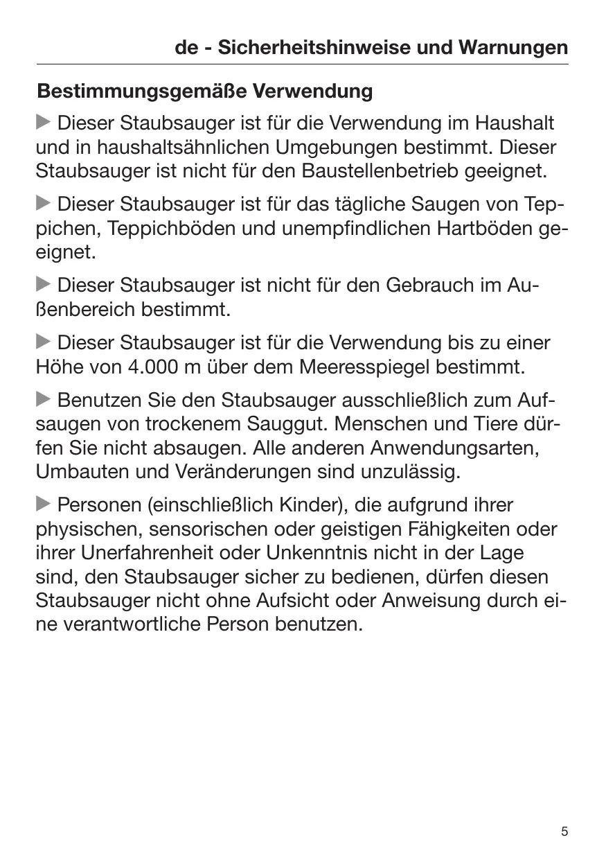 de - Sicherheitshinweise und Warnungen Bestimmungsgemäße Verwendung Dieser Staubsauger ist für die Verwendung im Haushalt und in haushaltsähnlichen Umgebungen bestimmt. Dieser Staubsauger ist nicht für den Baustellenbetrieb geeignet. Dieser Staubsauger ist für das tägliche Saugen von Teppichen, Teppichböden und unempfindlichen Hartböden geeignet. Dieser Staubsauger ist nicht für den Gebrauch im Außenbereich bestimmt. Dieser Staubsauger ist für die Verwendung bis zu einer Höhe von 4.000 m über dem Meeresspiegel bestimmt. Benutzen Sie den Staubsauger ausschließlich zum Aufsaugen von trockenem Sauggut. Menschen und Tiere dürfen Sie nicht absaugen. Alle anderen Anwendungsarten, Umbauten und Veränderungen sind unzulässig. Personen (einschließlich Kinder), die aufgrund ihrer physischen, sensorischen oder geistigen Fähigkeiten oder ihrer Unerfahrenheit oder Unkenntnis nicht in der Lage sind, den Staubsauger sicher zu bedienen, dürfen diesen Staubsauger nicht ohne Aufsicht oder Anweisung durch eine verantwortliche Person benutzen.