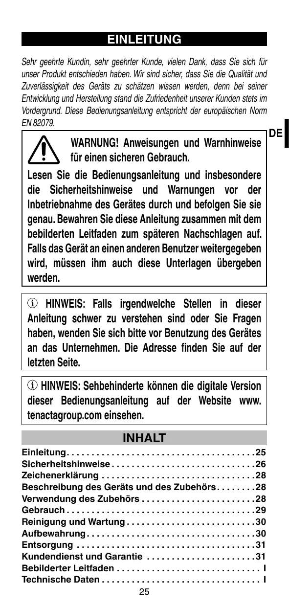 WARNUNG! Anweisungen und Warnhinweise für einen sicheren Gebrauch. Lesen Sie die Bedienungsanleitung und insbesondere die Sicherheitshinweise und Warnungen vor der Inbetriebnahme des Gerätes durch und befolgen Sie sie genau. Bewahren Sie diese Anleitung zusammen mit dem bebilderten Leitfaden zum späteren Nachschlagen auf. Falls das Gerät an einen anderen Benutzer weitergegeben wird, müssen ihm auch diese Unterlagen übergeben werden. HINWEIS: Falls irgendwelche Stellen in dieser Anleitung schwer zu verstehen sind oder Sie Fragen haben, wenden Sie sich bitte vor Benutzung des Gerätes an das Unternehmen. Die Adresse finden Sie auf der letzten Seite. HINWEIS: Sehbehinderte können die digitale Version dieser Bedienungsanleitung auf der Website www. tenactagroup.com einsehen.