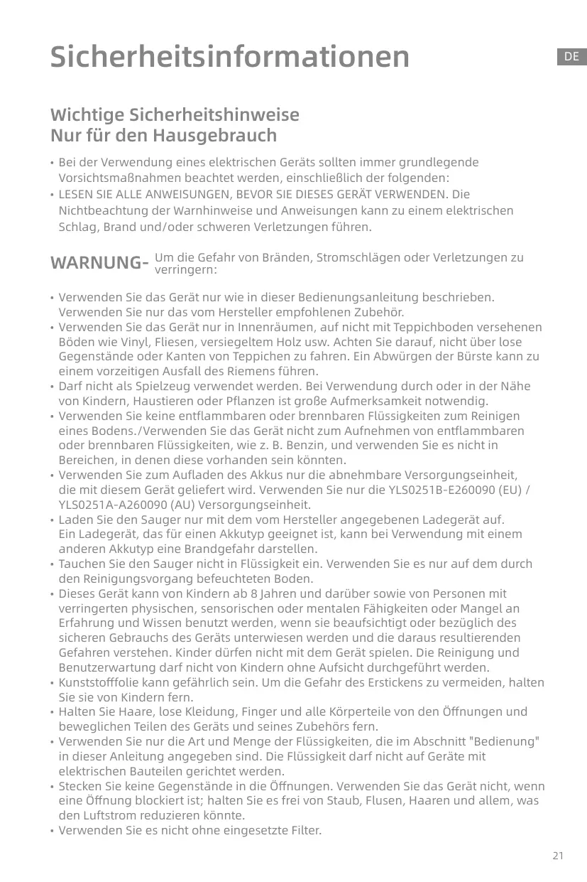 • N'utilisez l'appareil qu'à l'intérieur, sur des surfaces de sol non recouvertes de tapis, comme le vinyle, le carrelage, le bois scellé, etc. Veillez à ne pas rouler sur des objets non fixés ou sur les bords d'un tapis. Le fait de faire caler la brosse peut entraîner une défaillance prématurée de la courroie. • Ne laissez pas l'appareil être utilisé comme un jouet. Une attention particulière est nécessaire lorsqu'elle est utilisée par ou près d'enfants, d'animaux domestiques ou de plantes. • Ne pas utiliser un liquide inflammable ou combustible pour nettoyer un sol./Ne pas utiliser pour ramasser des liquides inflammables ou combustibles, tels que l'essence, ou utiliser dans des zones où ils peuvent être présents. • Pour recharger la batterie, utilisez uniquement le bloc d'alimentation amovible fourni avec cet appareil. Utilisez uniquement le bloc d'alimentation YLS0251B-E260090 (EU) / YLS0251A-A260090 (AU). • Rechargez l'aspirateur uniquement avec le chargeur spécifié par le fabricant. Un chargeur qui convient à un type de batterie peut créer un risque d'incendie lorsqu'il est utilisé avec un autre type de batterie. • Ne plongez pas l'aspirateur dans un liquide. Utilisez-le uniquement sur un sol humidifié par le processus de nettoyage. • Cet appareil peut être utilisé par des enfants à partir de 8 ans et des personnes ayant des capacités physiques, sensorielles ou mentales réduites ou un manque d'expérience et de connaissances s'ils ont reçu une supervision ou des instructions concernant l'utilisation de l'appareil en toute sécurité et s'ils comprennent les risques encourus. Les enfants ne doivent pas jouer avec l'appareil. Le nettoyage et l'entretien par l'utilisateur ne doivent pas être effectués par des enfants sans surveillance. • Le film plastique peut être dangereux. Pour éviter tout risque de suffocation, tenez-le à l'écart des enfants. • Tenez les cheveux, les vêtements amples, les doigts et toutes les parties du corps éloignés des ouvertures et des parties mobiles de l'appareil et de ses accessoires. • N'utilisez que le type et la quantité de liquides spécifiés dans la section "Opérations" de ce guide. Le liquide ne doit pas être dirigé vers des équipements contenant des